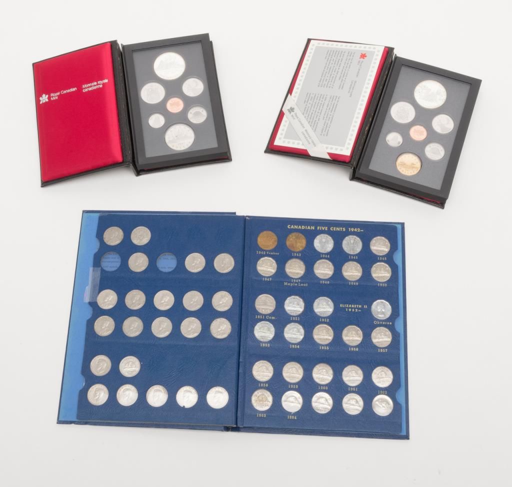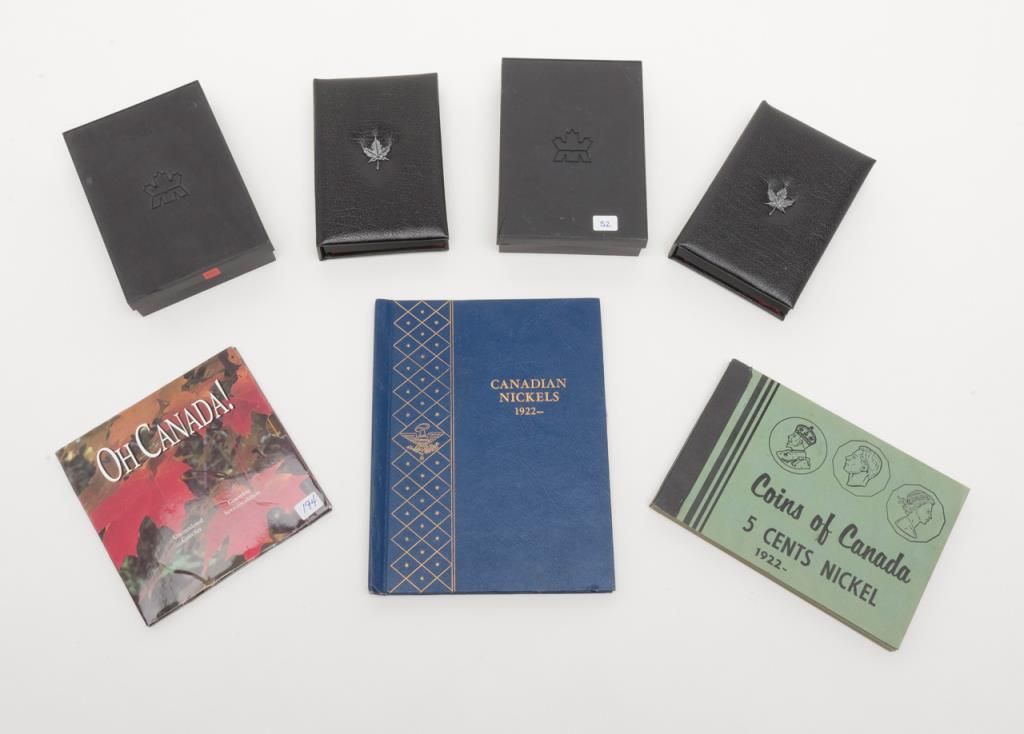Bonanza lot consisting of a collection of Canadian nickels from 1922-1942 missing only the 1925 and the 1926 far 6; another album of Canadian nickels (1922-1960) missing 1925, both 1926 nickels, the 1942 TOMBAC, the 1947Dot and the 1948; an “OhCanada” Commemorative 1997 Set; a Royal Canadian Mint 1987 cased set and a Royal Canadian Mint 1989 cased set. Est.: $80-$160.