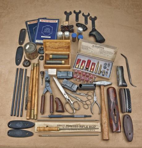 Bonanza lot consisting of two Winchester catalogs, #89, 1934 and 1932, both good condition. Winchester Western salesman samples in original box. Two Winchester #4 paper cartridges in salesman’s type fancy grain display box with velvet lining. .38-40 Winchester mold in near fine condition with excellent cavities, with 90% blue with fine handles. Winchester marked large size scissors, 4-1/2” blade. Winchester small size screwdriver, #7160. Can of Winchester 7801 lacquer, opened with partial label. Winchester 224-5 flat bill pliers. Four blued steel Winchester marked loaders. Winchester marked 3-piece brass and steel cleaning rod. German made 12-20ga choke gauge. Winchester Tack-hammer. Winchester marked lid opener. Along with miscellaneous gun accessories including four Winchester buttplates, two hard rubber, two milled steel. Three 742 Remington magazines, three hard-rubber buttplates, antique oil can, large frame double-action Smith & Wesson gutta percha grips, pair of replacement Colt grips, snap caps, cleaning rod, screw in chokes, three choke tools, Lyman Cutts tube. Marble 98-28 rifle cleaning rod in case, small Winchester paper scissors. And a
