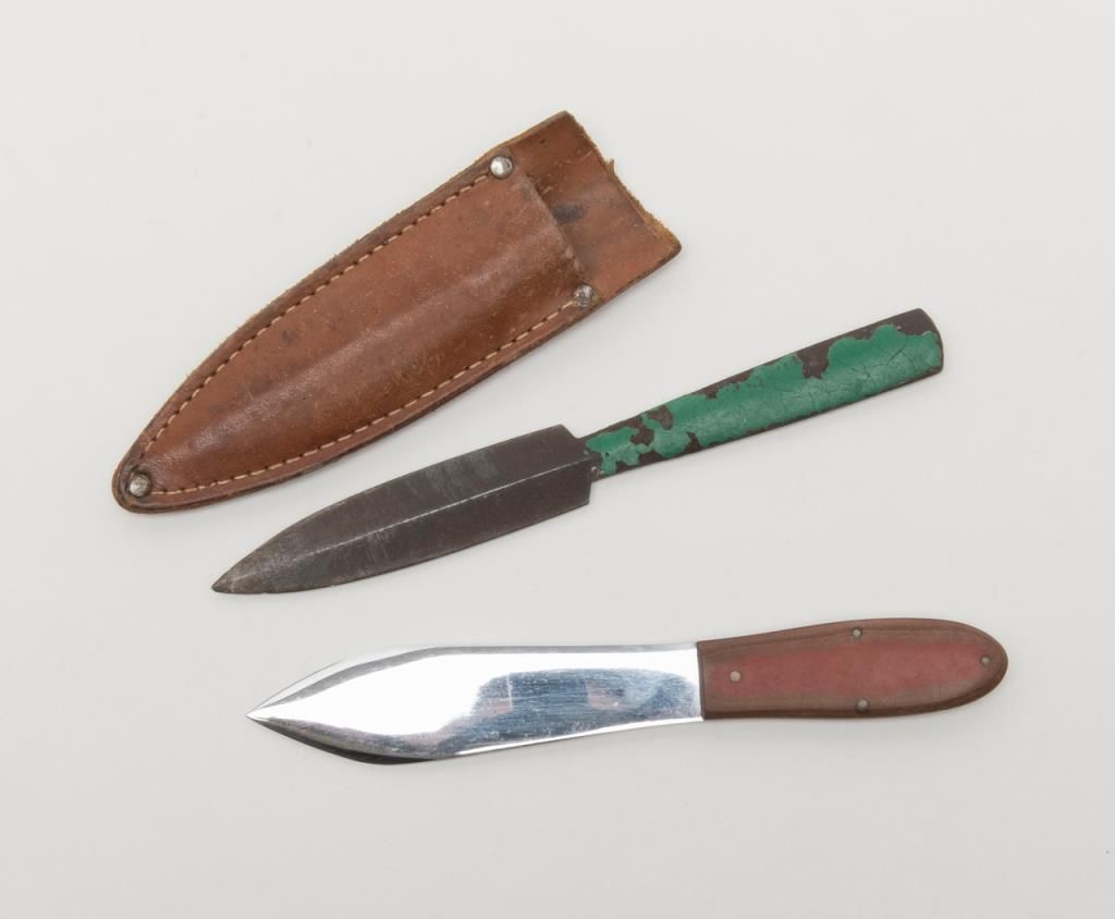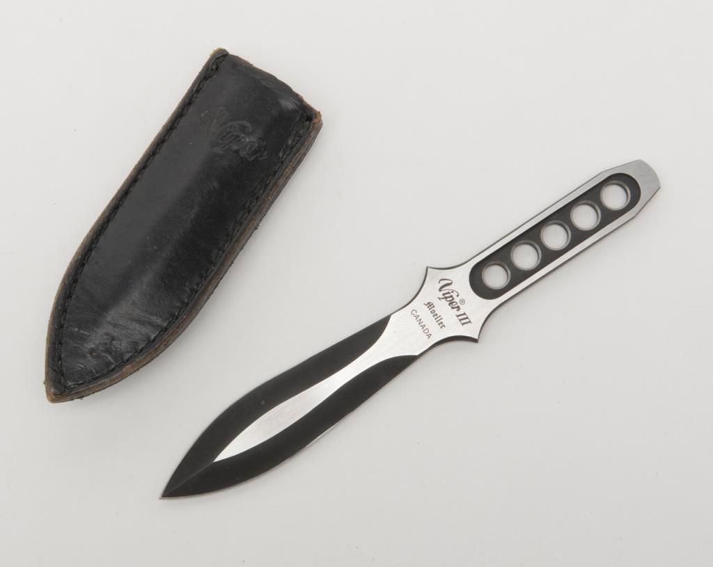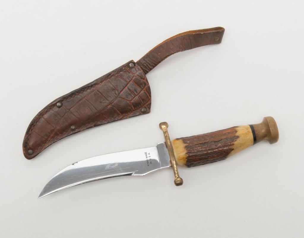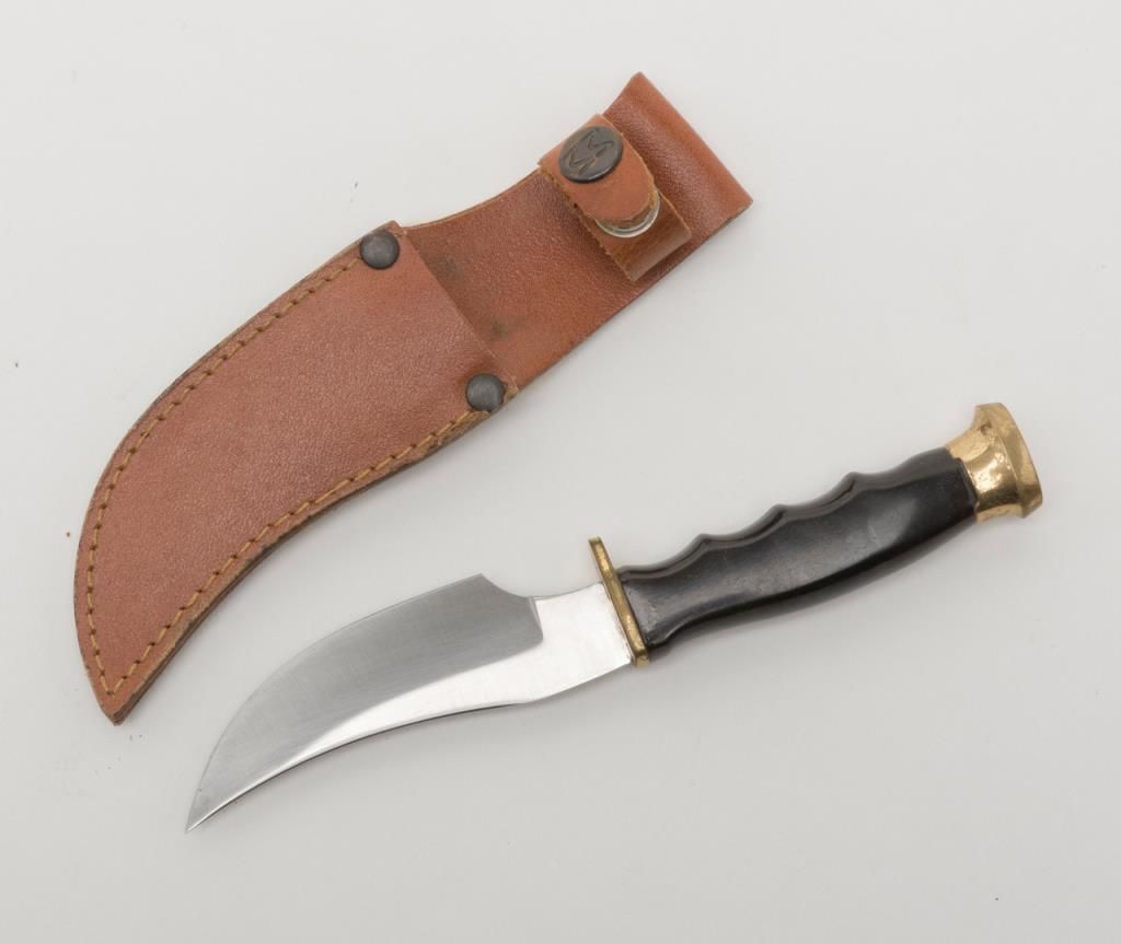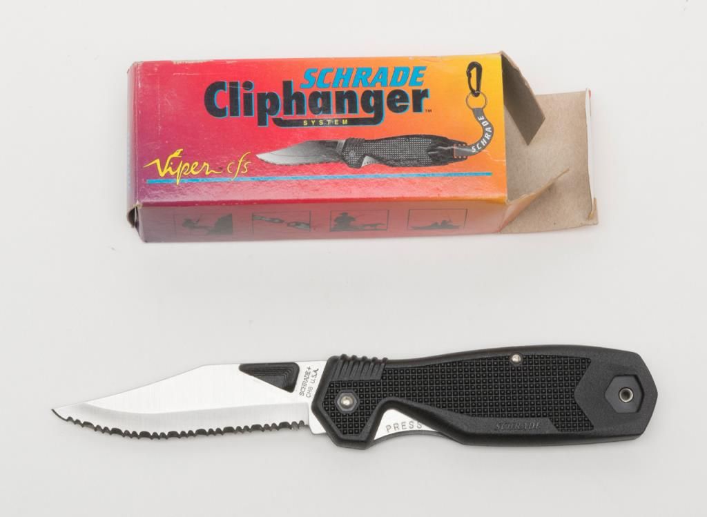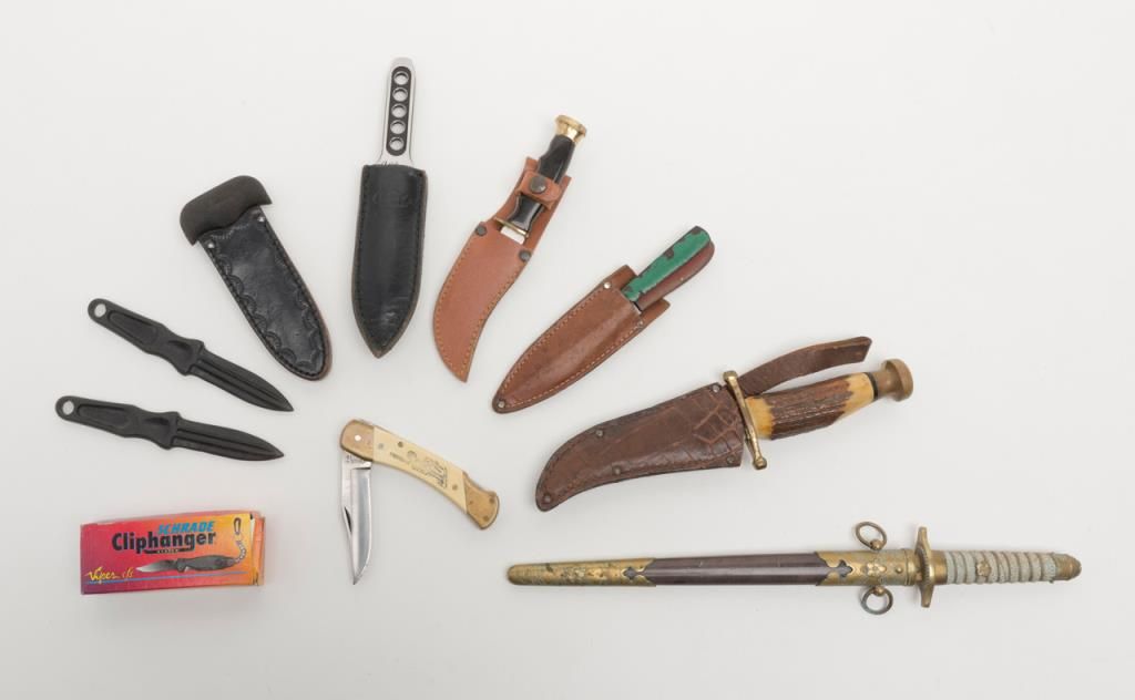 Bonanza lot of 10 misc. knives including a Case XX Kodiak clip point with stag grip approx. 10-3/4” overall with a 6” blade and leather sheath, a Schrade Cliphanger in the box, a Muela skinner with leather sheath, a Schrade folder, a Viper III with belt clip-on sheath, a Japanese dress dagger and accompanying scabbard plus more; great items for the gun or knife show circuit! Est.: $100-$200.