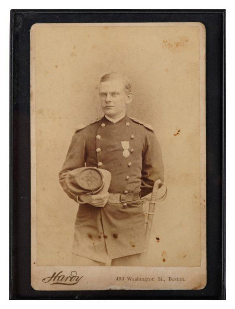 Bonanza lot of 10 separately framed Western and military photos and postcards including 5 postcards of cowgirls (one a photo postcard of “Prairie Rose” riding “High Rock” at the Pendleton Round-Up); one photo postcard of a woman hunter holding a Winchester Model 1897 shotgun and game bird; a cabinet photo of a soldier in uniform by Hardy of Boston; a photo postcard of 4 Western men, one showing his cartridge belt and holster; a 6th plate tintype of 3 Indian Wars era soldiers in uniform and a photo postcard of Buffalo Bill Cody with this horse, Winchester and buckskin outfit. Est.: $150-$300.