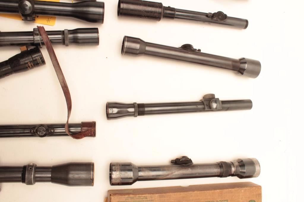Bonanza lot of 15 misc. scopes including a Weaver K10/60B; an Oigee/Berlin; a Zeiss; a Hensoldt-Wetzlar; a Weaver K25; another 2 Zeiss scopes; a Bushnell; a Leupold in its box, a Lyman Alaskan, and more; most withgood optics. Est.: $600-$1,200.