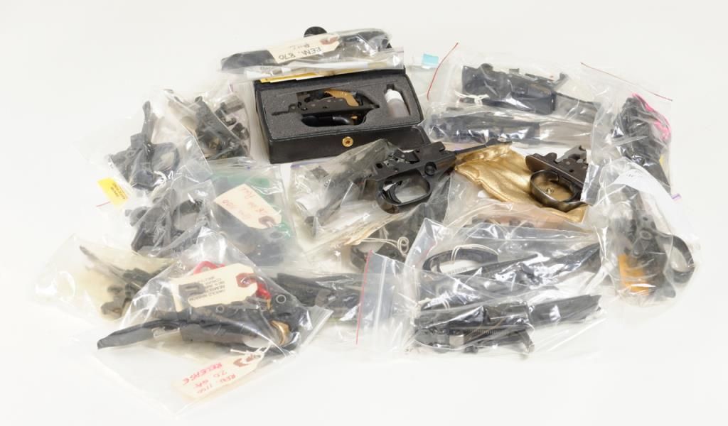 Bonanza lot of 20 trigger sets for a variety of shotguns, including Winchester Model 12s, Remington 1100s, Remington 870s, Winchester Super Xs, etc. Est.: $500-$1,000.