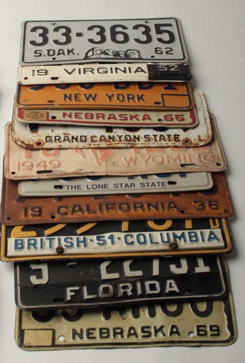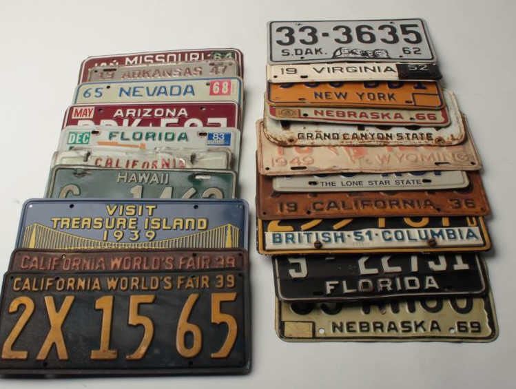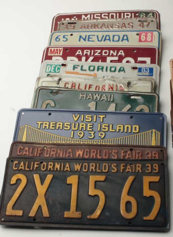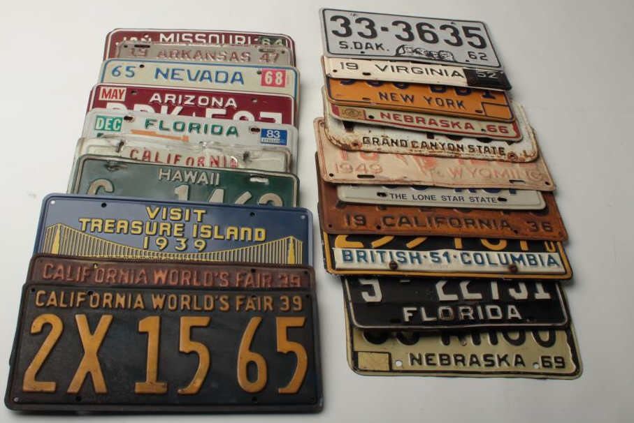 Bonanza lot of 24 old license plates ranging from the 1930’s to present, many states represented plus some rarities (California’s Worlds Fair, 1939); great decorators for the motorhead’s garage. Est.: $100-$200.