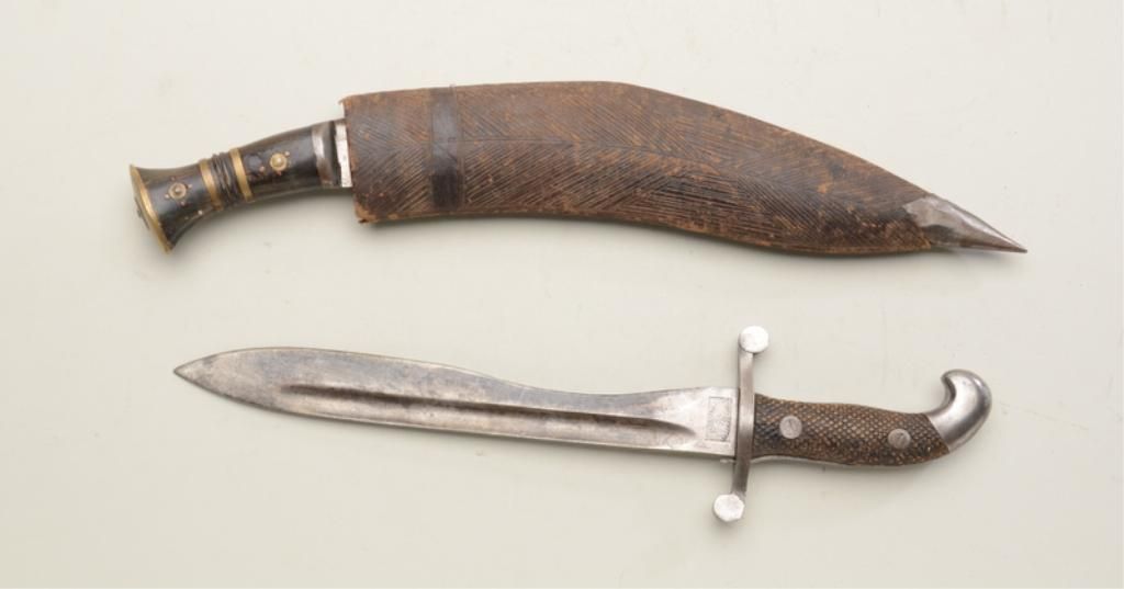Bonanza lot of 8 misc. collectible knives and assorted items including two large Southeast Asian or Philippine curved blade knives with sheaths, one carved wood and the other leather covered, both approx. 18” overall and both showing age (not tourist trade items); a smaller sized curved blade piece with wood sheath and accompanying smaller knife in same sheath, approx. 12” overall; a wood swagger stick marked “Korea 65-66”; a turned woodswagger stick with a cast brass dragoon head pommel; a Spanish Artillery bolo-style knife, approx. 17-1/2” overall with checkered wood grip; a modern mid-eastern style belt knife in wood sheath and a small Japanese daggerwith brass mountings and ray skin wrapped grip approx. 15” overall with attached wood sheath that needs adjustment to fit this knife. Est.: $350-$500.