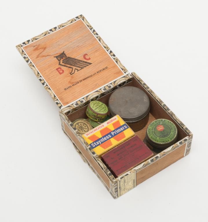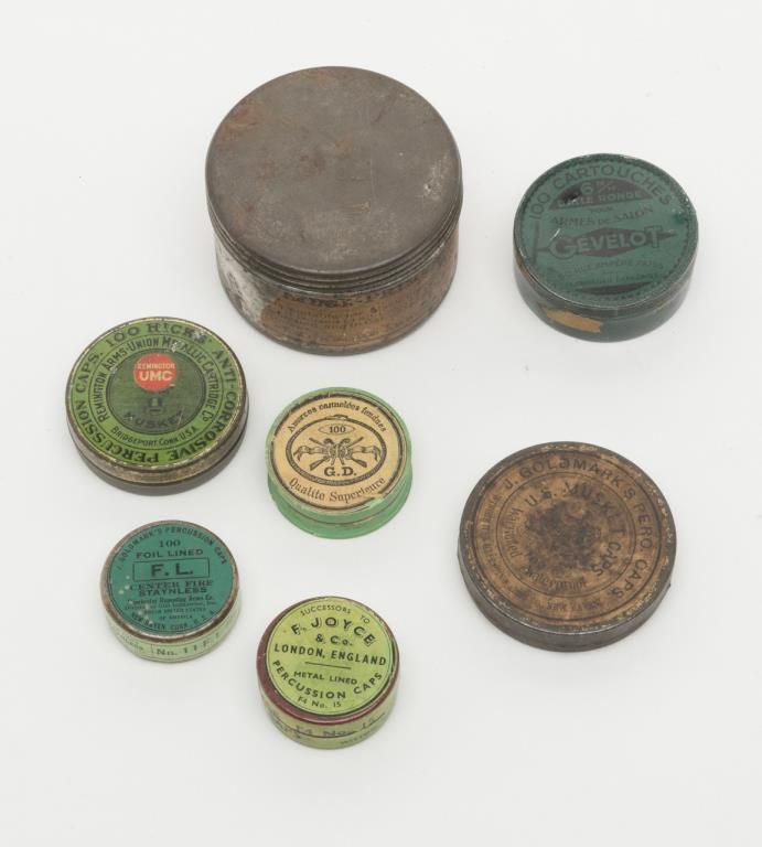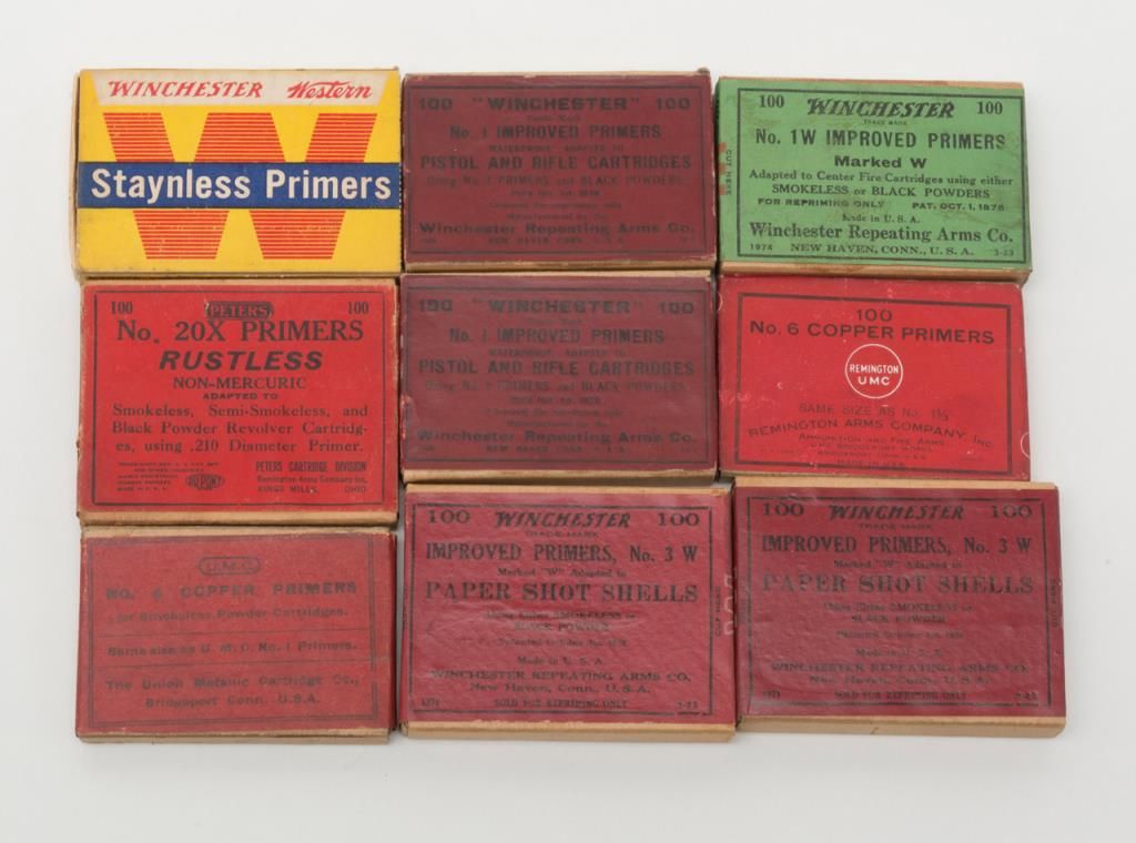 Bonanza lot of 9 boxes of collectible primers including 2 boxes of Winchester No. 1 Improved Primers for pistol and rifle cartridges with red label and both sealed and in fine condition; 2 boxes of Winchester No. 3 W Improved Primers forPaper shot shells with red label, both sealed and in fine condition; 1 box of Winchester No. 1 W Improved Primers “for repriming only”, green label, sealed and in very good + condition; 1 box of U.M.C. No. 6 Copper Primers for SmokelessPowder cartridges, red label, sealed and in very good to fine condition; 1 box of Remington/UMC No. 6 Copper Primers, red label, sealed and in very good to fine condition; 1 box of Peters No. 20X Rustless Non-Mercuric Primers, red label, sealedand in very good to fine condition and a box of Winchester Western Staynless No. 1 ½ -108 Primers in yellow, white, red and blue, overall very good + condition. Also included in this lot are 6 cap tins; an F. Joyce & Co., 3 different J. Goldmarks’ styles including one for U.S. Musket caps; a Gevelot 6mm tin, a Remington/UMC tin and a great Frankford Arsenal tin containing layers of primers with partial label that reads “…….RIDGE PRIMERS”. “……. Is suitable for black powder …… y. It is