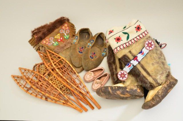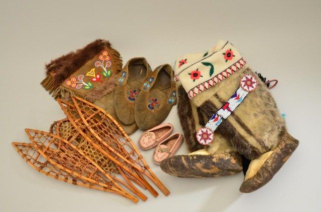 Bonanza lot of Canadian Northwest Indian items from an old estate including a pair of beaded thick hide gauntlets with leather fringe in overall good condition; three pairs of miniature bent wood and sinew snow shoes; small pair of leather beaded tourist baby moccasins; pair of muckluck boots, pair of old beaded hide moccasins and later beaded strip. Est.: $250-$500.