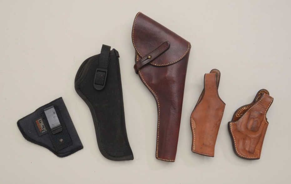 Bonanza lot of approx. 16 misc. holsters and several gun rugs; mostly leather with some maker marked; mostly for revolvers in good to very good condition; great for the gun show circuit. Est.: $75-$150.