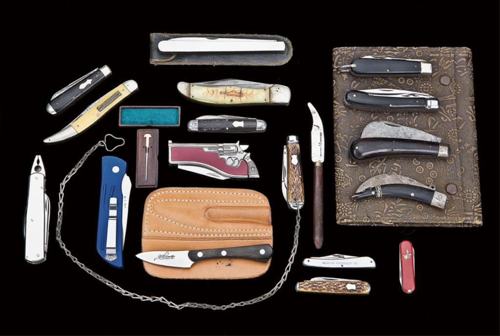 Bonanza lot of approx. 18 folding knives and misc. small advertisers including Camillus,Diplomat, Western States, Millersloss and Scott, S.F., Austin, Stockton, CA., A.G. Russell, Auto Tech, L & K Co., S.F., Moore Machine Co., Remington-UMC, etc. Also included in this lot is a 1940’s era carry case for numerous pieces of cutlery. From the Hugh Hayes estate. Est.: $200-$300.