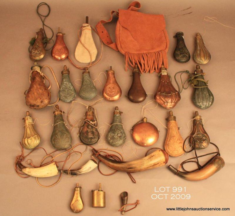Bonanza lot of approx. 21 powder flasks, many old, some new with some in brass, others in steel, some with decoration, others plain and for pistols, rifles and shotguns; all varying in condition from fair to good. Also included is amodern leather hunting bag and four powder horns in varying sizes and ages and one newer priming horn. Est.: $400-$800.