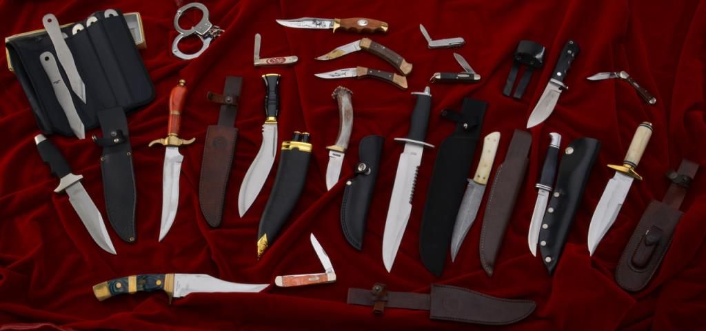 Bonanza lot of approx. 30 misc. knives of all makes and models, folders, skinners, belt knives, etc. 2 modern large fantasy swords and a King Neptune triton plus assorted misc. sheaths, empty boxes, small stands, some stag horns that can be made into slabs and a mini library of reference books and catalogs on knives and razors. Est.: $150-$300.