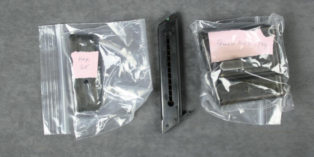 Bonanza lot of eight misc. semi-auto firearms magazines including two for a Starr Super 9mm; one for a Model 65 H&R; one for a Browning 7.62mm pistol, one for a Charter Arms AR-7; one for a Winchester Model 52; one unmarked .22 caliber magazine (possibly for a Hi Standard Target) and a magazine for a 1949 French Mas rifle. Est.: $75-$125.