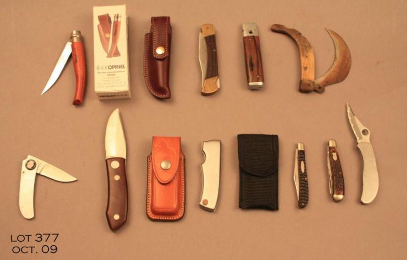 Bonanza lot of folding knives. Includes a rare Colt folding knife with 3” blade and Colt marked leather sheath, an Opinel with a 3.75” blade and leather sheath, a Spyderco, and Buck; 10 total. The Colt knife alone is worth 400-800. Est.$350-$700.