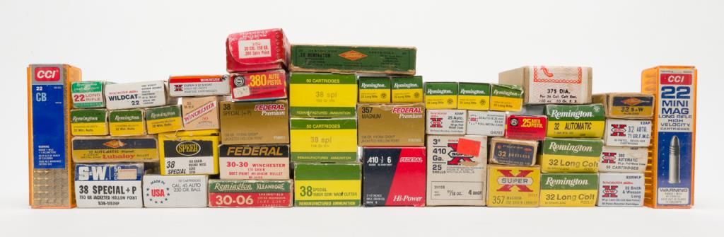 Bonanza lot of misc. collectors ammo of various makers and calibers including Smith & Wesson, Remington, Winchester, Western, etc. and in calibers from .22 to .30-06 Springfield, .357 Magnum, etc. Est.: $150-$300.