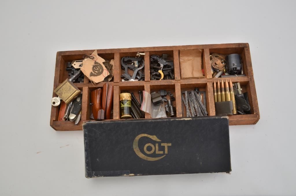 Bonanza lot of misc. items including two modern wood presentation casings, each for a pair of SAA revolvers; a pair of Russian-marked binoculars in a French leather case; an empty leather binocular case; alarge wood partitioned tray of misc. military rifle parts, several pocket knives, a “US” marked lock; misc. grips; a Colt Single Action Army Revolver “black” cardboard factory box for a .45, 5-1/2”, hard rubbergrips in overall fair condition with some taping to edges and corners; military metal emblems, etc. From an old estate. Est.: $150-$300.