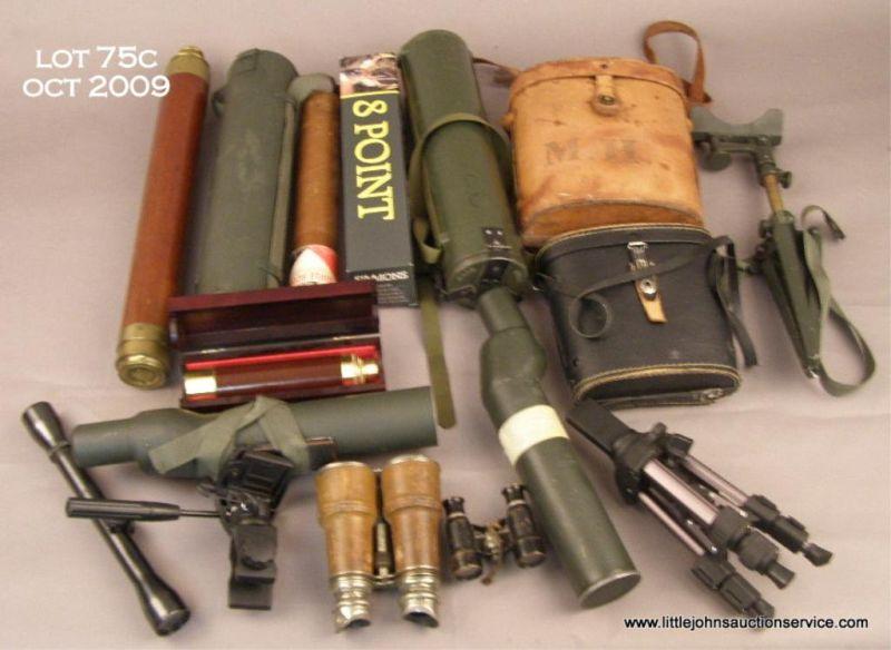 Bonanza lot of optics and accessories including two Guardforce spotting scopes with stands; two military green scope carry cases, one marked “M164”; one pair of Japanese binoculars in case, another large pair of military style binocularswith leather case marked “M.H.” and “D-43813” (7x50 Model 15); a pair of older European binoculars circa pre-1900; a wood and brass telescope inscribed “Spencer and Co. , London, Day or Night”; three misc. rifle scopes including aMarlin scope 4X in its shipping tube. Est.: $500-$750