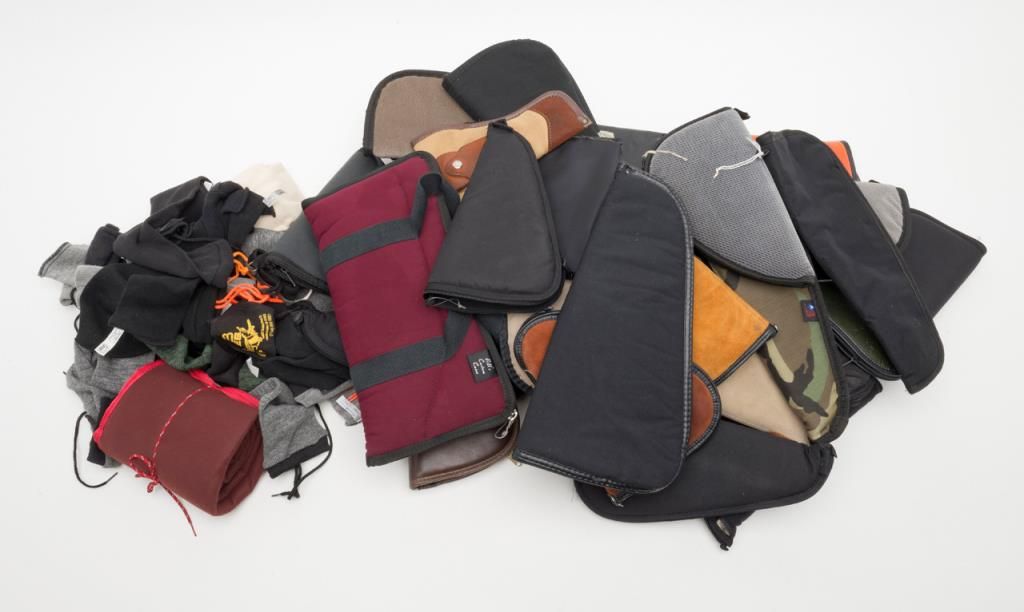 Bonanza lot of pistol, revolver and rifle soft boots including approx. 30 pistol and revolver boots, 6 rifle boots and a box of pistol and rifle socks; all good quality and in good condition, various makes and sizes; great for transportingyour guns or for the gun show circuit. Est.: $175-$275.