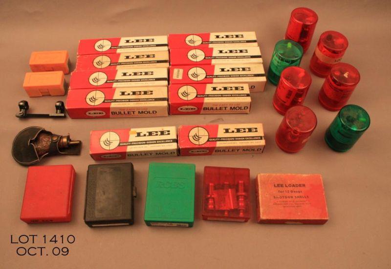 Bonanza lot of reloading dies, misc. gun parts, sight parts, powder measuring devices, Lee bullet molds in their factory boxes, etc.; a great box lot with many goodies for the hand loader. Est.: $100-$200.