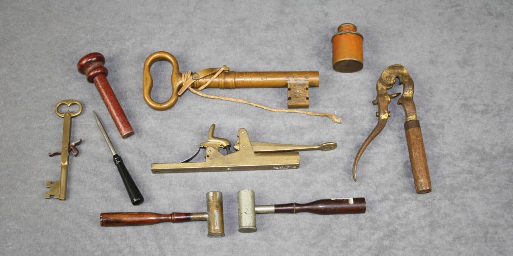 Bonanza lot of several dozen misc. powder  measurers from different makers, some with  rosewood handles, an old decapper,  interesting large brass reproduction of a  matchlock key gun and two additionalreproduction percussion brass oddities, one  another key gun and one a trap gun.   Est.:   $150-$300.