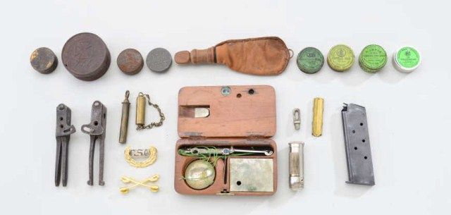 Bonanza lot of small including a grouping of cap tins, a leather and wood powder flask, an old Colt and an old Smith & Wesson bullet mold, 1911 magazine, shotgun cleaning rods, Winchester saddle ring parts, match safe,flints, portable wooden gold scale, springs, etc.; lots of goodies for the collector workbench. Est.: $200-$400.