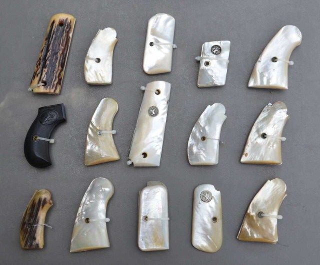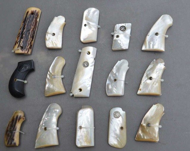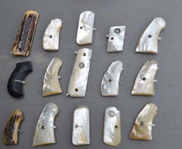 Bonanza lot of two plastic trays of misc. pairs of grips, primarily for Colts and Smith & Wessons, mostly pearl, some stag, some ivory, etc. approx. 32 pairs, most in at least good to very good condition includinggrips for revolvers and semi-auto pistols; also two small black powder flasks; great for the gunsmith or for the gun show circuit; a life-time collection from an estate. Est.: $1,000-$2,000.