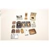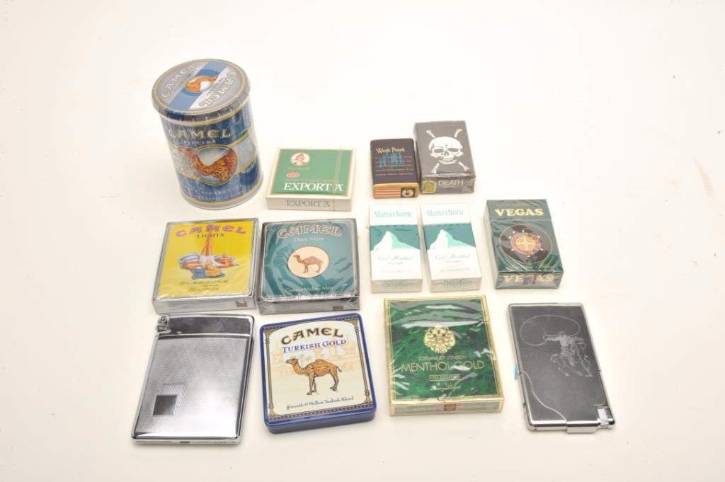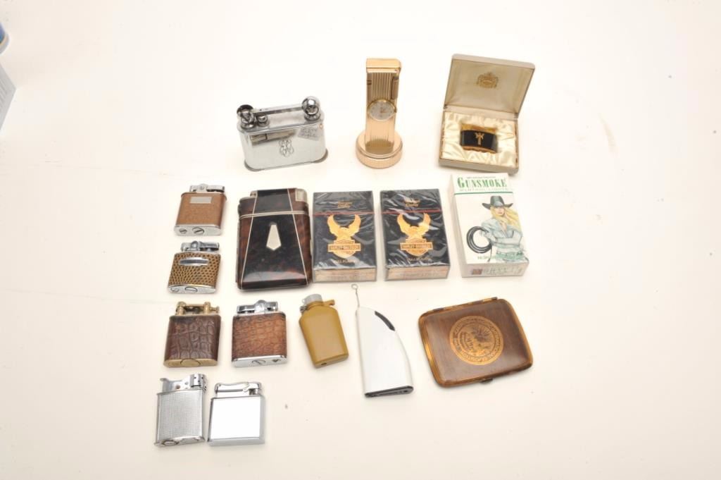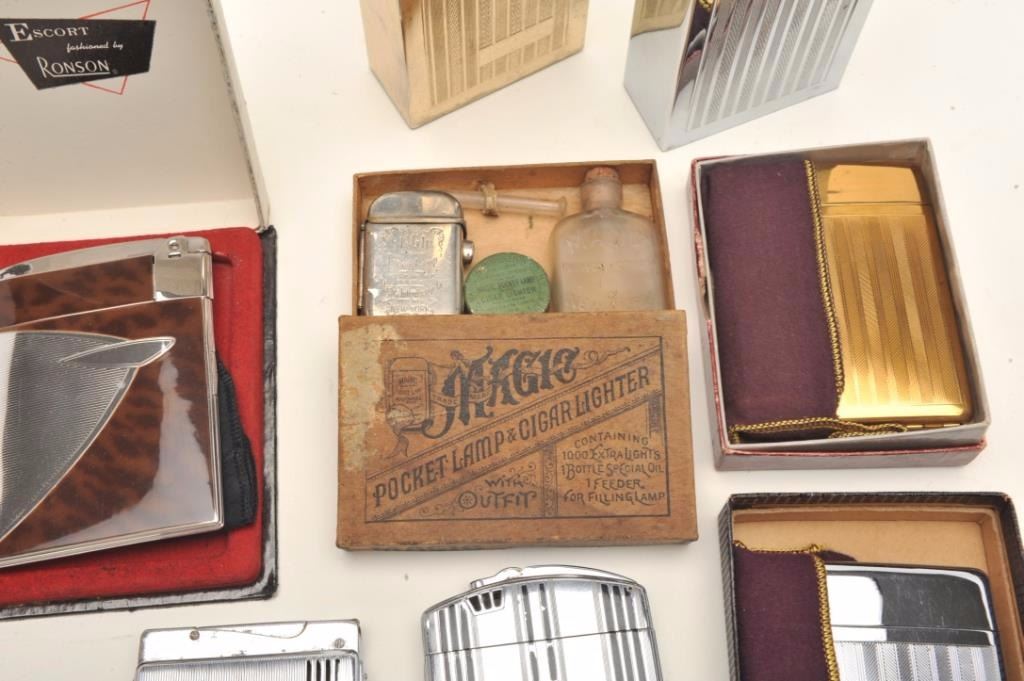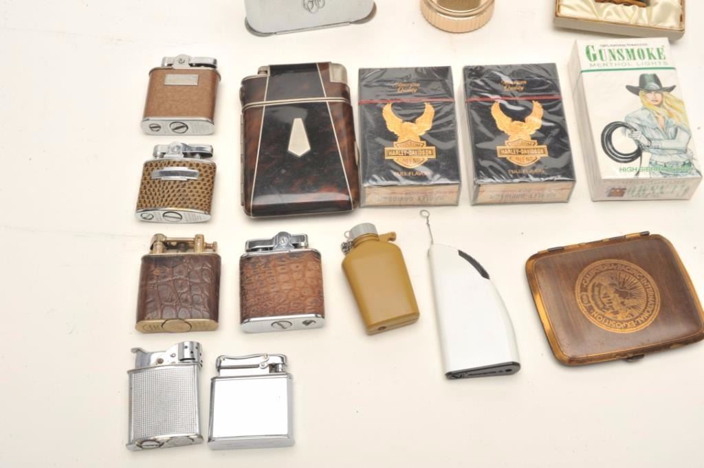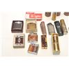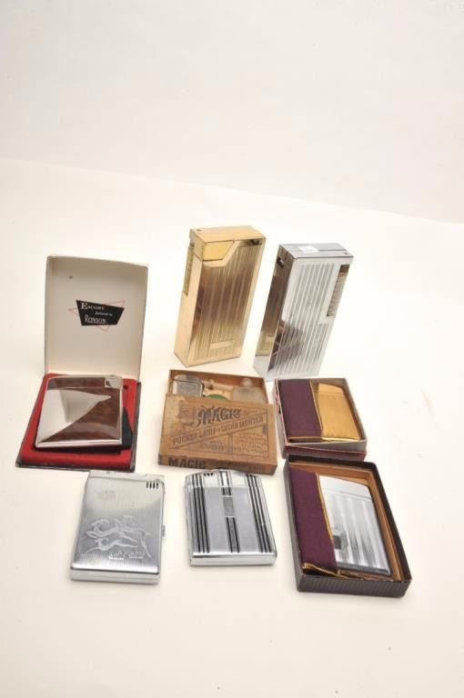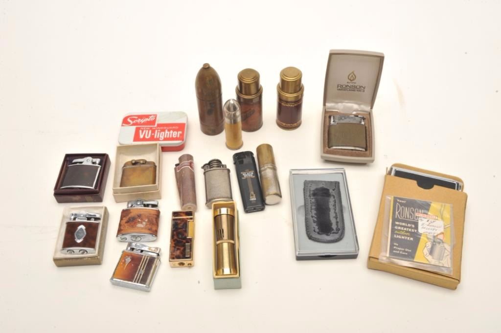 Bonanza lot of vintage pocket & table size lighters and misc. smoking ephemera including various makers like Ronson, Swank, etc.; different sizes, some advertisers; also a number of old cigarette boxes by variousmanufacturers; also a great antique Magic Pocket Lamp & Cigar Lighter set in original cardboard box (ca. 1890). (Reference: James Flanagan’s definitive work “The Big Book of Cigarette Lighters”). Est.:$200-$300.