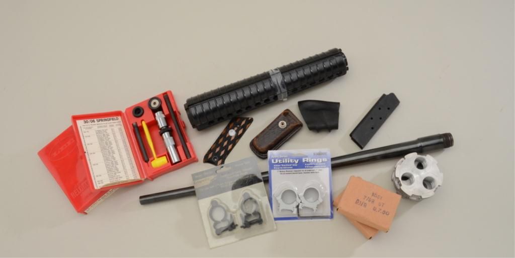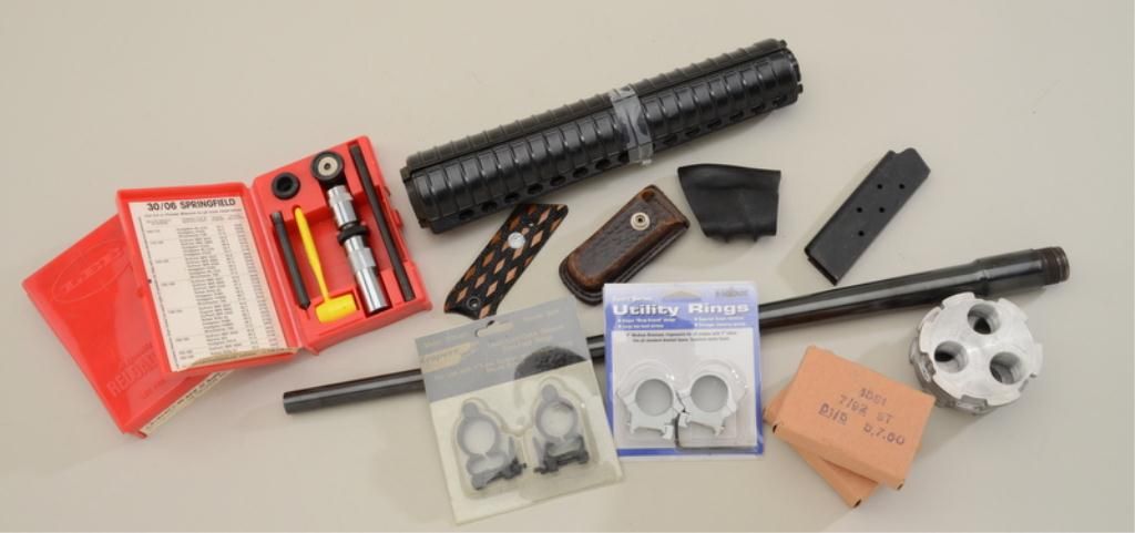 Bonanza shooter’s lot consisting of misc. reloading equipment, dies, brass, slide blanks for 1911 style semi-autos, misc. wood grips, a new gun lock, .32 caliber barrel, and a refinished .30 caliber barrel. Est.:$125-$250.