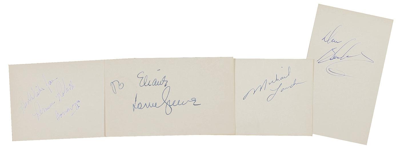In-person ink signatures of Dan Blocker, Lorne Greene (ins), Michael Landon, and Pernell Roberts (ins) on individual off-white 5 x 3 cards. Roberts also adds “Bonanza,” under his in-person signature. In fine condition.