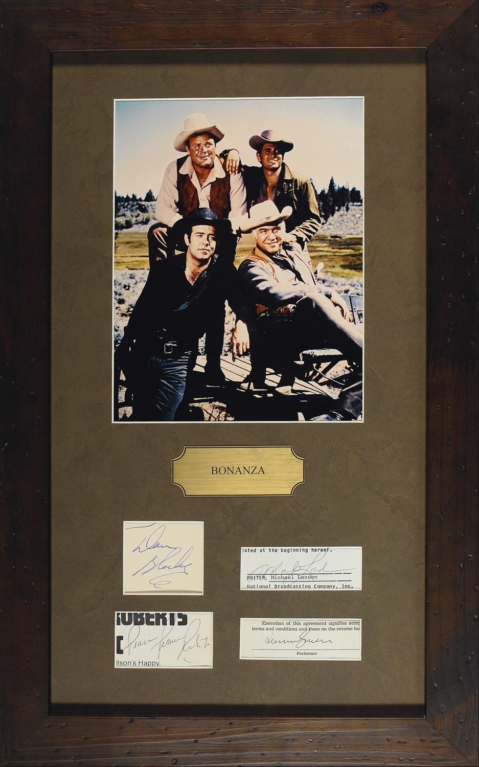 Fountain pen signature of Dan Blocker on an off-white card; ballpoint signature of Michael Landon on an off-white slip clipped from a document; an ink signature of Lorne Greene on an off-white slip clipped from a document; and a ballpoint signature of Pernell Roberts on a clipped magazine or program page. All four are matted and framed together with a color photo of the Cartwrights, and a small plaque, to an overall size of 14.5 x 23. In fine condition.