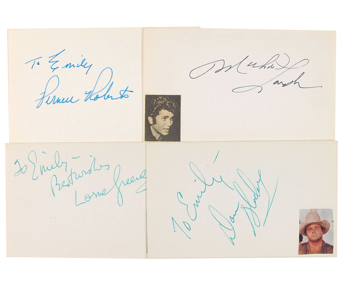 Four vintage in-person ink signatures on individual off-white 5 x 3 cards, three inscribed to “Emily.” Signers are: Lorne Greene, Michael Landon, Dan Blocker, and Pernell Roberts. In overall fine condition.