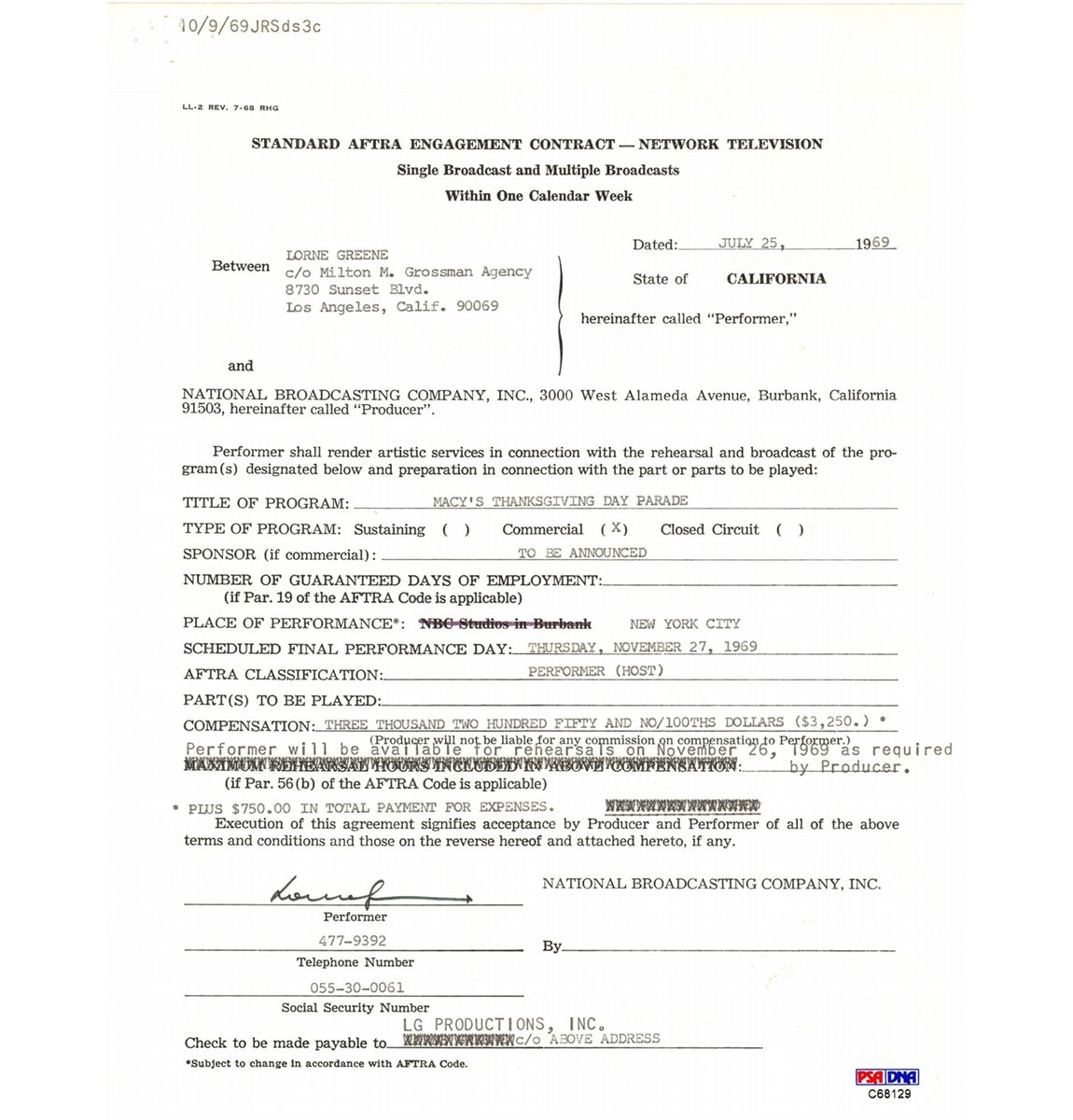 Choice lot featuring trio of signed documents featuring the stars of the classic westem television show "Bonanza": Michael Landon, Dan Blocker and Lome Greene. First up is a three-page document. 8.5" x 11", dated December 30, 1959, NBC Letterhead, in which Blocker to amendments to his contract for "Bonanza". The document is signed at the conclusion by Blocker in blue ballpoint pen along with an NBC executive and stands in overall fine condition. From Michael Landon we have a two-page agreement between Landon and NBC for terms to an unspecified contract. June 2, 1982, signed at the conclusion by Landon in blue ballpoint pen. The document is in overall fine condition. Lastly, we have a two-page television appearance agreement, 8.5" x 11", July 25, 1969, in which Greene agrees to appear on the Macy's Thanksgiving Day Parade for the sum of $3,250. The document is signed on the front page by Greene in black ink and stands in overall fine