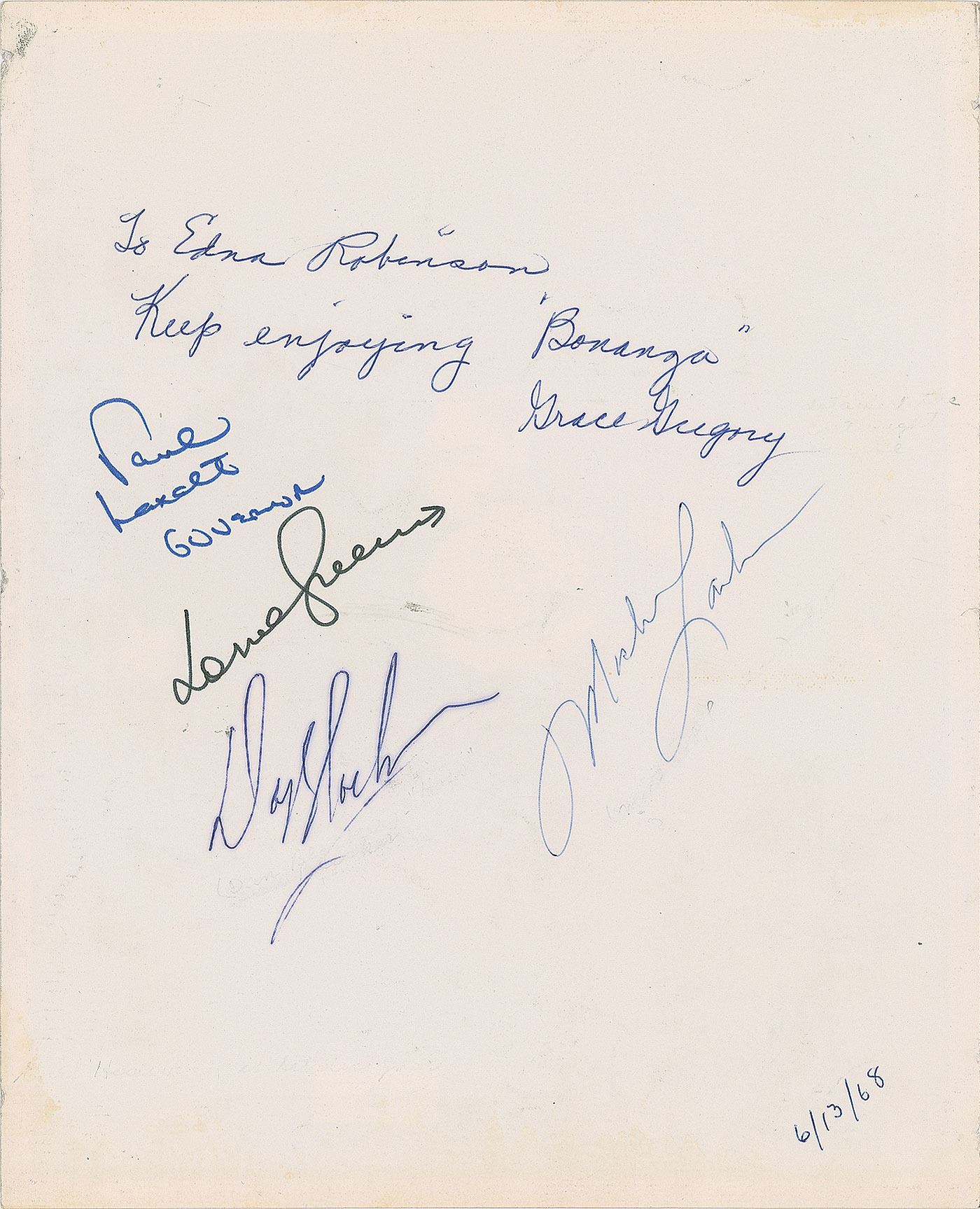 Vintage glossy 10 x 8 photo of Ben, Hoss, and Little Joe Cartwright posing with set designers from the show Bonanza, signed on the reverse in blue ballpoint by Michael Landon and Dan Blocker, and in black felt tip by Lorne Greene. The reverse is also signed by Nevada Governor Paul Laxalt, and pioneer set decorator Grace Gregory, who adds an inscription, "To Edna Robinson, Keep enjoying 'Bonanza.'" Collector's notations on front and reverse date the signatures to June 13, 1968. In very good to fine condition, with impressions on the photo side from the signatures on the reverse. Accompanied by a photo taken at the time of the signing, showing Landon posing with the recipient, with the reverse bearing collector's notations: "'Little Joe' Michael Landon and me at Ponderosa Ranch at dedication of Bonanza's TV series ranch house at Incline Village. Gov. Paul Laxalt was introduced by Lorne Greene."