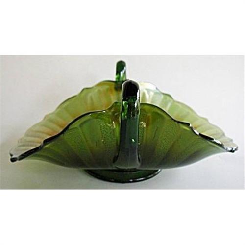 Fenton Stippled Rays handled bonbon or basket in choice lime green color. <BR>Fenton produced glass from 1907 to 1925 and the edge on this piece is unique to Fenton.<BR>Some bubbles and a straw mark as shown. Smooth back with no pattern.