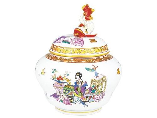 Porcelain, colour enamel painting and gilt. Light blue ground, Chinese famille rose style Ming-decoration. Plastic fish on the cover. The tail is repaired. Marked: Herend, circa 1940 Size: 19 cm