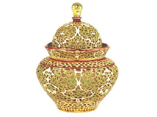 Porcelain faience, finely pierced, colour painted and gilt. Archaic decoration round the rim and on the cover. Glued final. Marked on a paper label on the bottom: Ernst Wahliss, Wien & London (distributor), Under the label there is a pressed number and gold painted five towers.Zsolnay, Pécs, 1888. Size: 23 cm