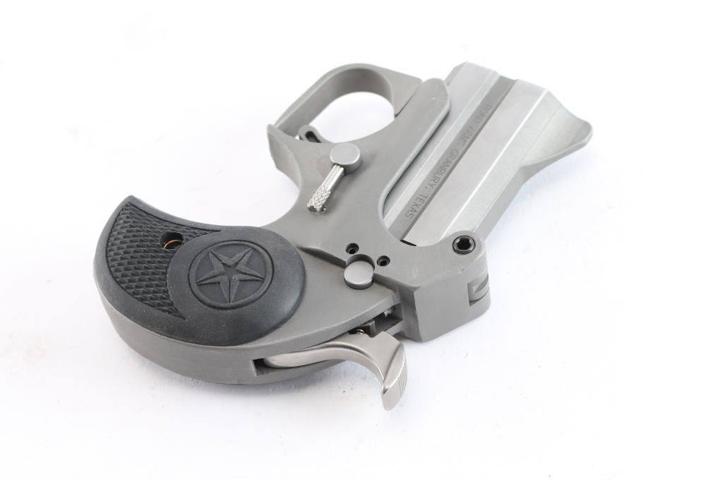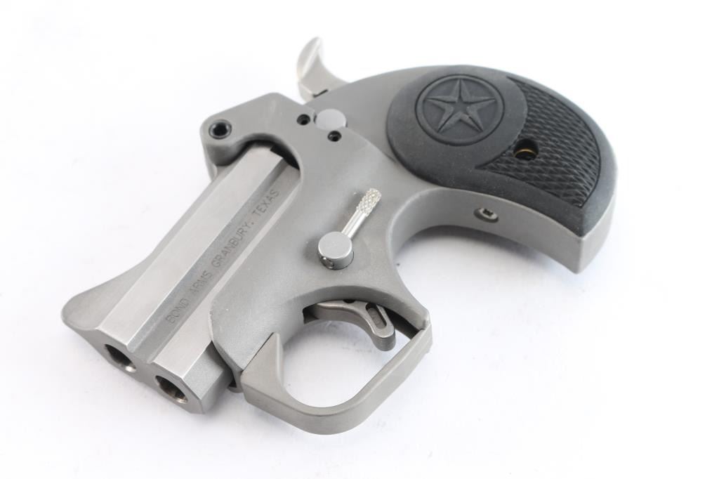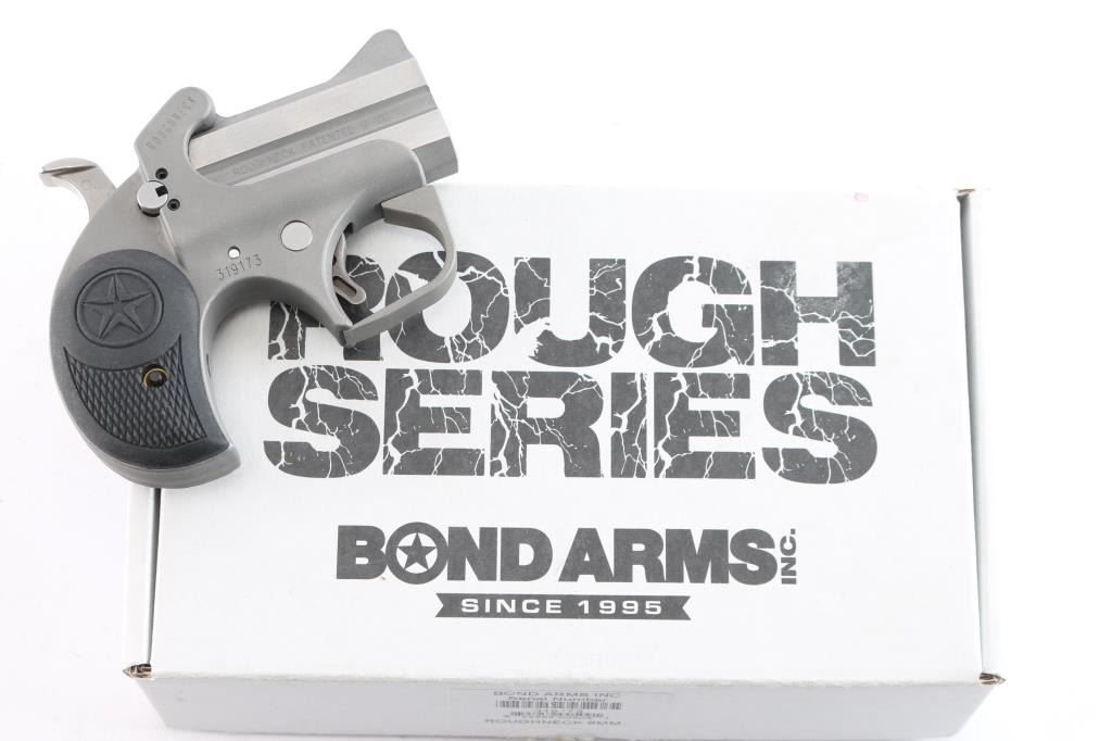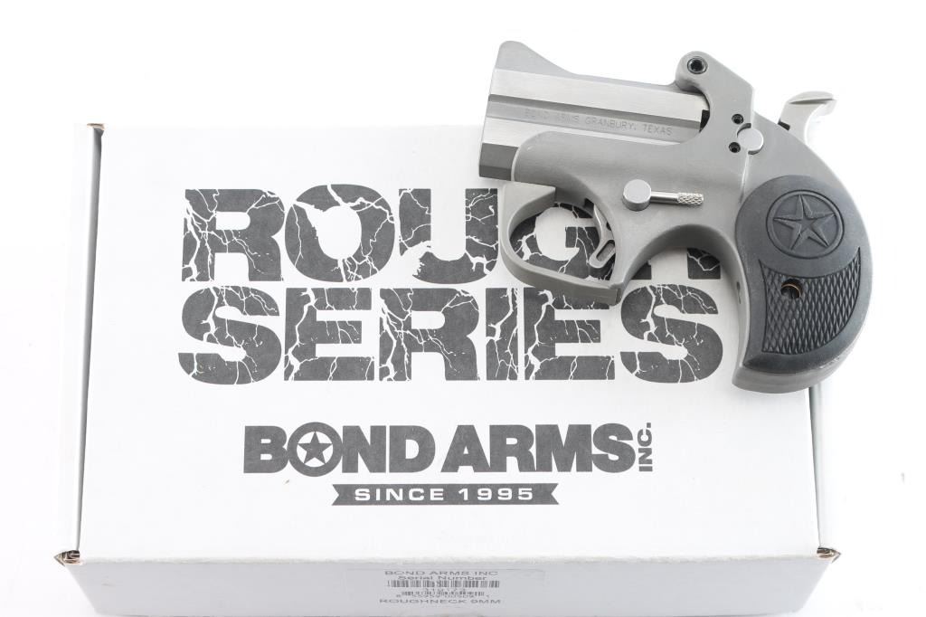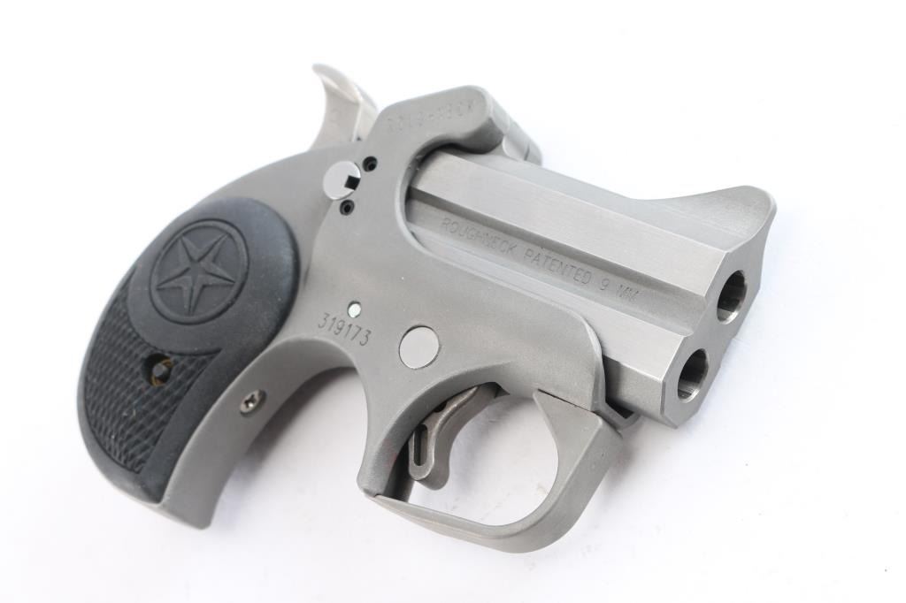 Made in the U.S.A. by Bond Arms out of Granbury, TX. the Roughneck is an over under derringer chambered for 9mm ammunition . It features 2.5" stainless barrels and gray parkerized frame, integral sights, spur trigger, serrated hammer spur and two piece black rubber grips with checkering and a Texas Star. Metal finish looks very good. Grips are fine. Bores are excellent. Comes with original factory cardboard box and owners manual.