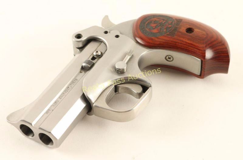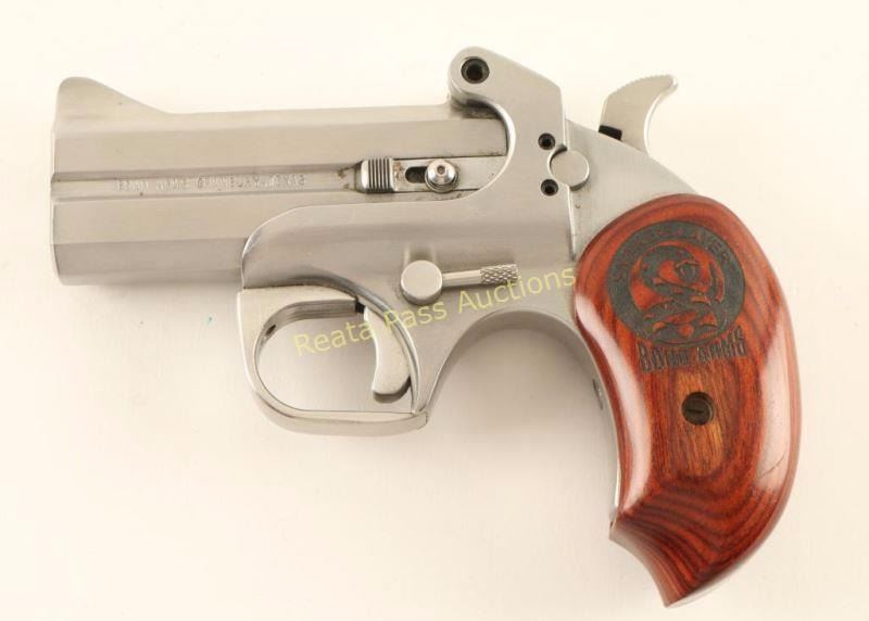 Stainless steel under/over double barrel derringer chambered for both .45 Colt & 3" .410 gauge shells. Features a brushed finish, 3 1/2" barrels, fixed sights, extractor, push button safety, spur trigger, rebounding hammer with rotating barrel selector, trigger guard, and laser engraved laminated rosewood grips. Derringer exhibits light handling wear and two small nicks on the barrel from the serrated hammer spur. Action is sound, bores are excellent and grips are fine. Condition is near excellent. ***Modern Firearm***