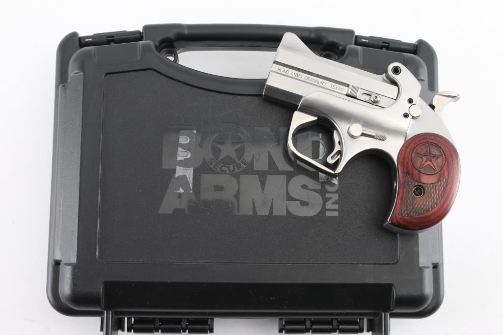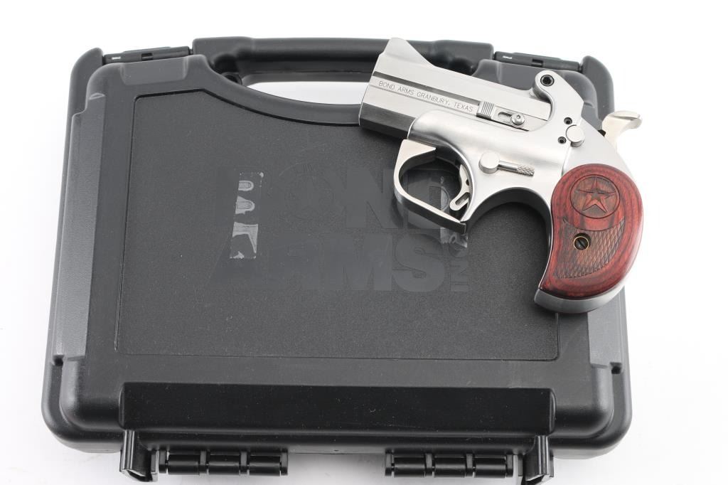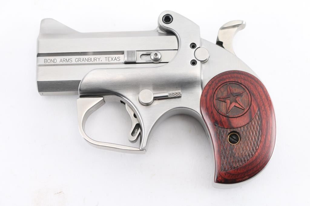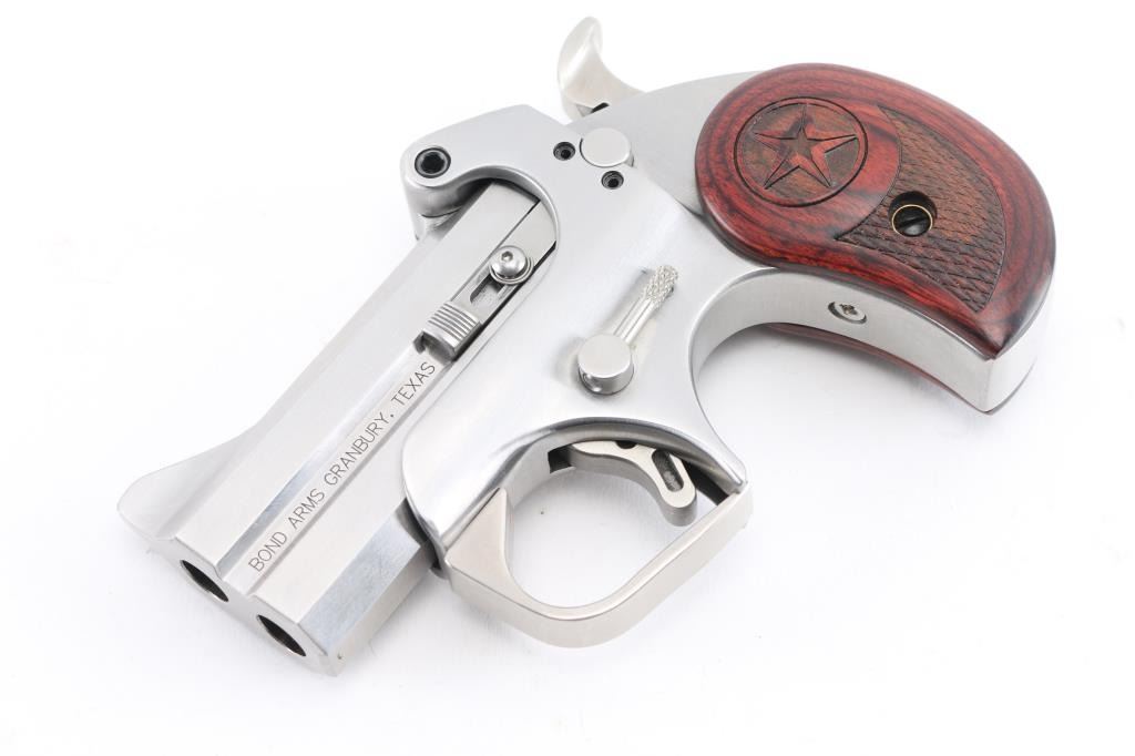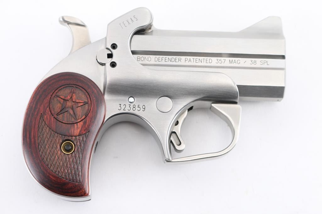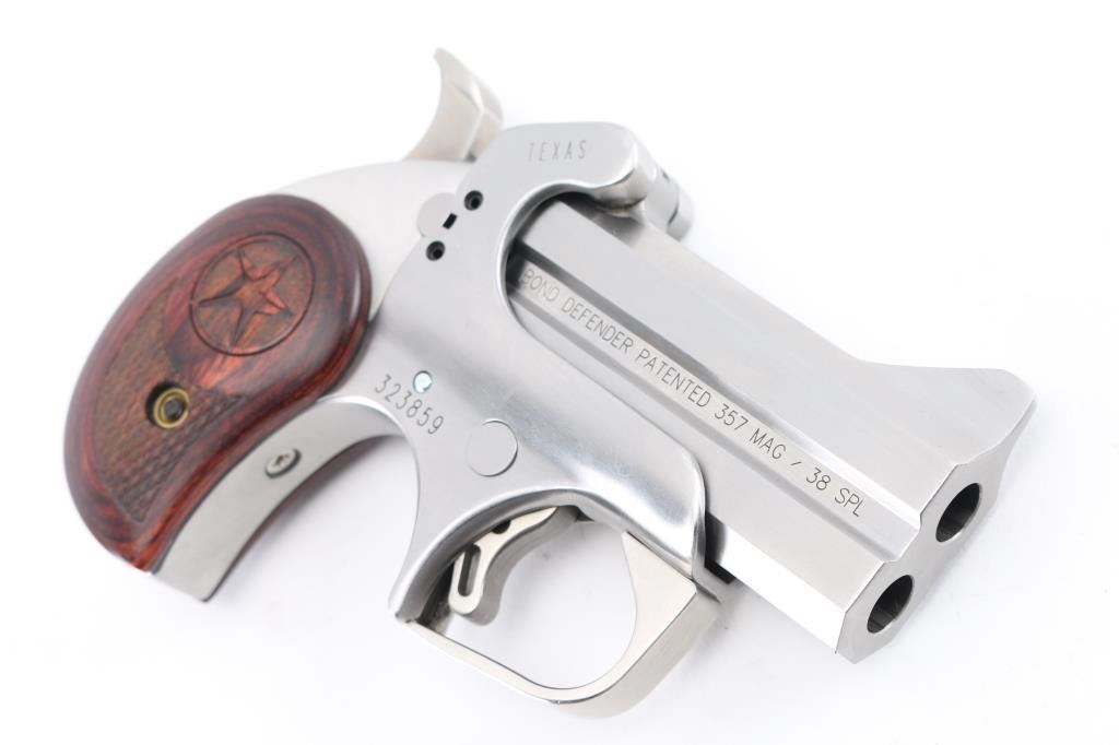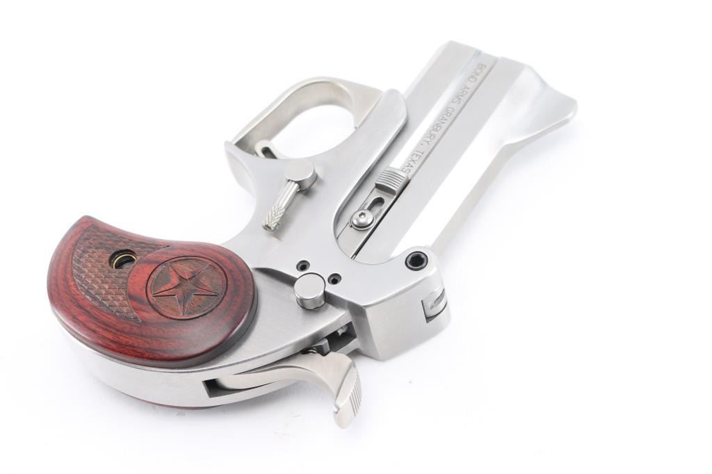 'Texas Defender' Stainless steel two shot derringer accepts 38 Special or 357 Magnum cartridges. Features break open over/under barrel assembly, manual extractor lever, manual safety, fixed sights, checkered wood grips with engraved western stars, 3" barrels. Bores are excellent. Brushed stainless finish is near pristine with few minor blemishes. Grips are excellent. Includes original box (lists different caliber, barrels have been replaced) and a tan leather pocket holster (no belt loop). Condition is NRA Excellent *** Modern Firearm ***