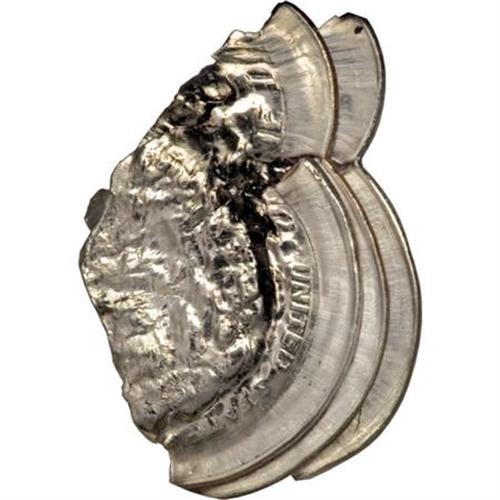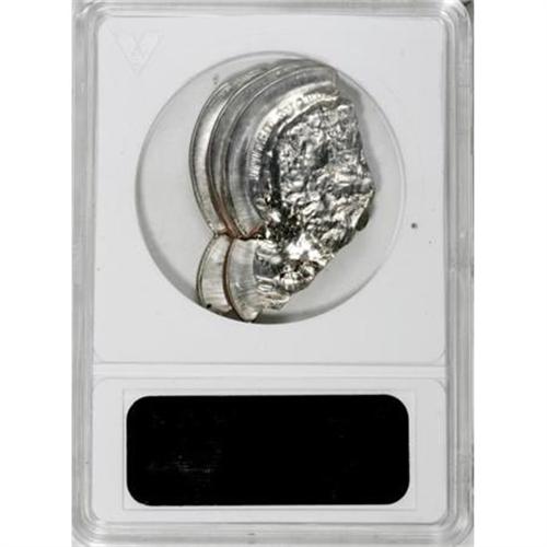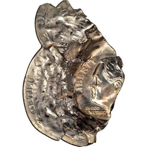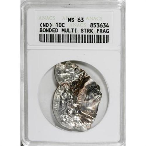 <B>Undated Clad Roosevelt Dime--Bonded Multi-Struck Fragment--MS63 ANACS.</B></I> A dime stuck to the obverse die, and was struck at least two additional times, fusing with two newly fed planchets. The result is a thick, fused metal fragment with a stack of three rims, when viewed from the reverse. The outer obverse rim has a brockage impression of the left-side reverse legends. The final strike is 50% off center toward 3 o'clock, with the date and mintmark off the flan. The reverse from this strike has a rough surface but shows a faint, distorted torch. Likely, the reverse die for this final strike was blocked by scrap, perhaps a separated fragment from the present error.<BR><BR><B>Coin Engraver:</B> John R. Sinnock<BR><BR><b>Shipping:</b> Coins & Currency (<a target="_blank" href="http://www.heritageauctions.com/common/shipping.php">view shipping information</a>)