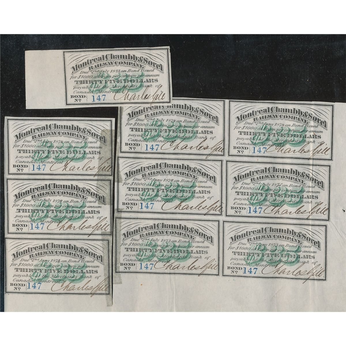 Bonds; 1872-1882 Montreal, Chambly & Sorel Railway Company $35 Bonds. Sheet of 6, Sheet of 3 and single issue. VF or better with some glue residue.