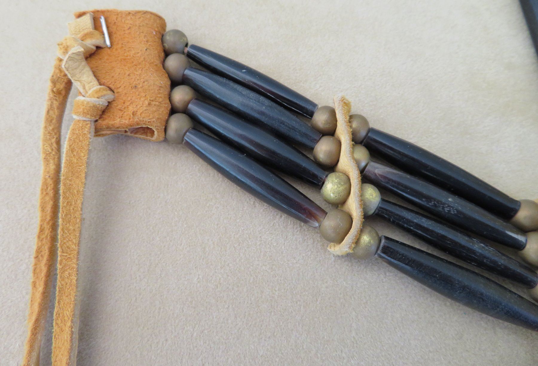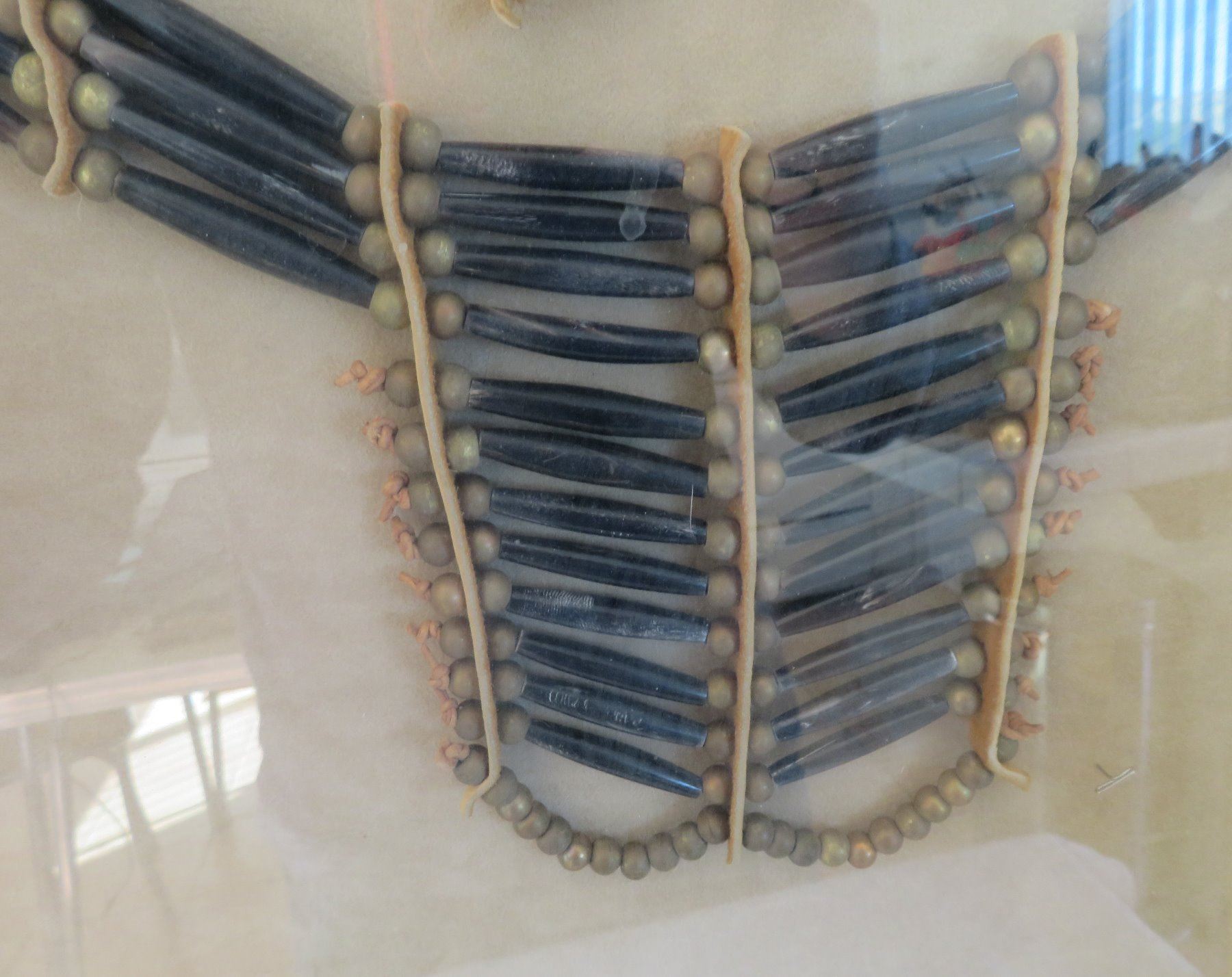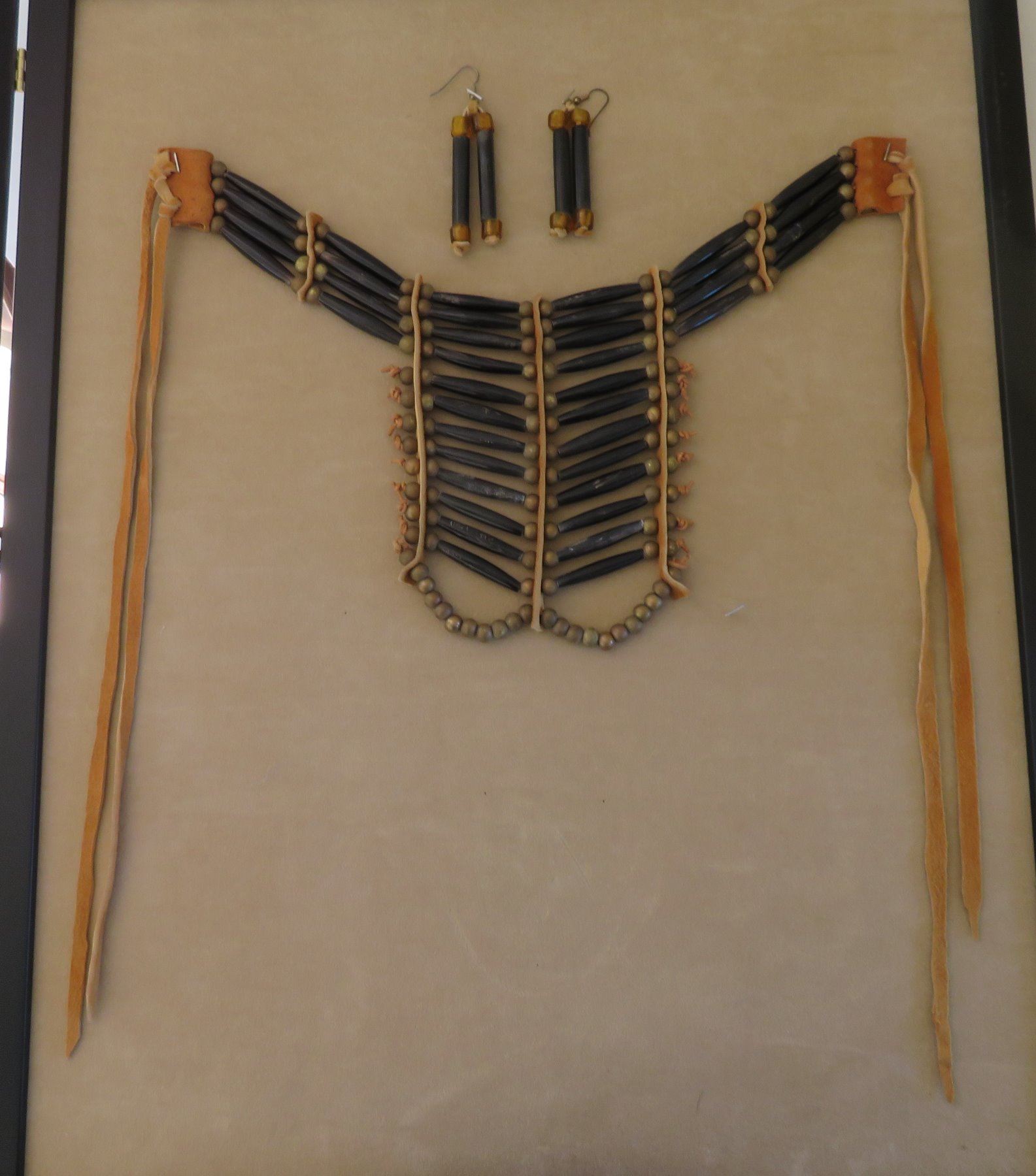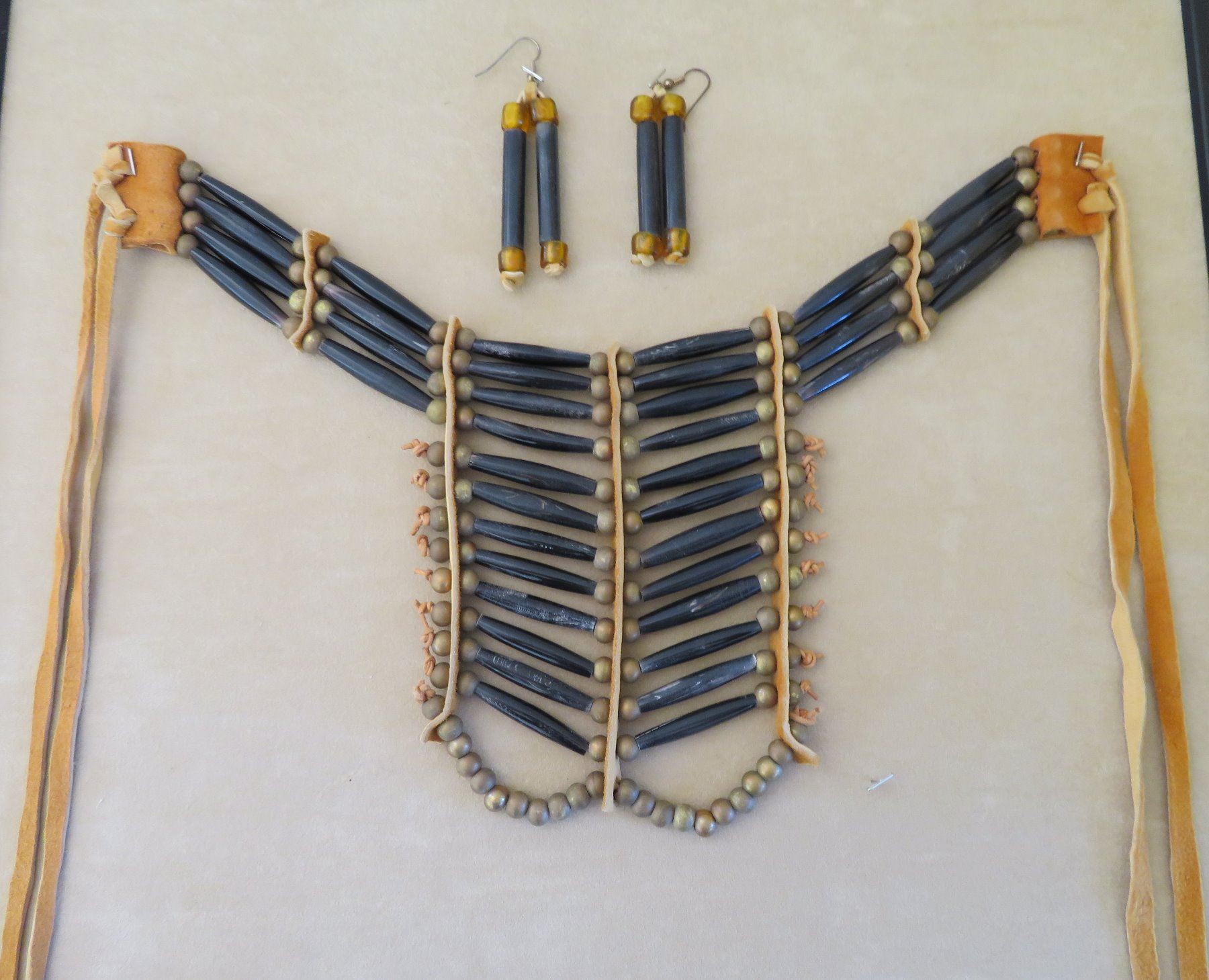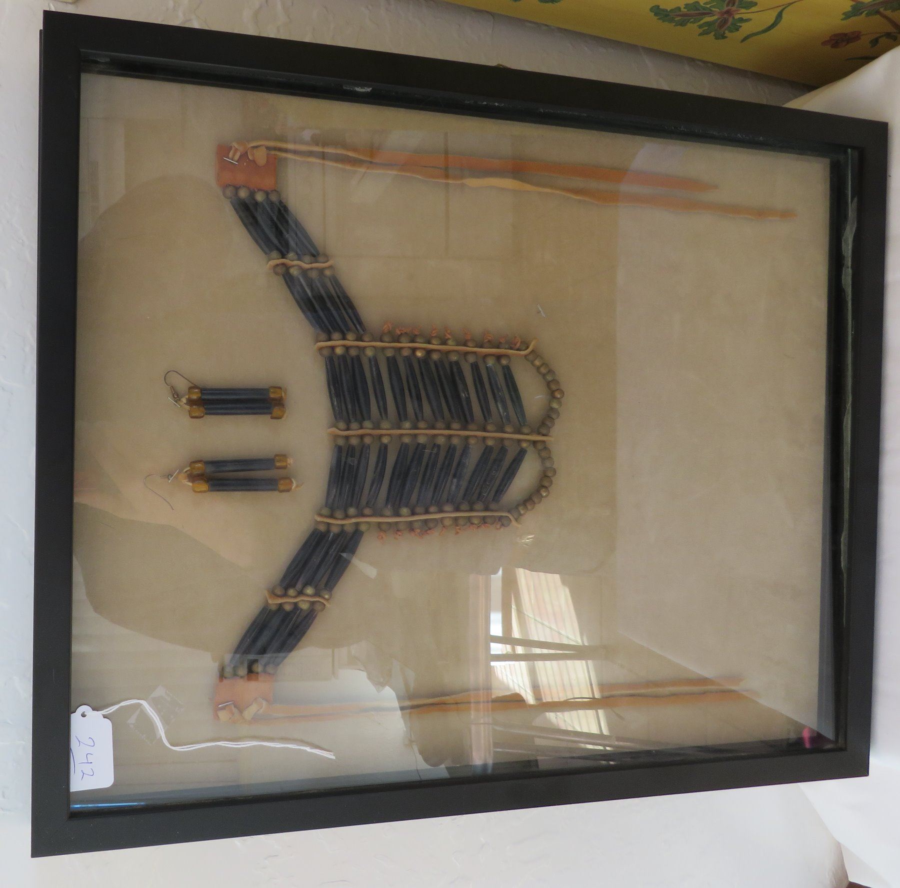 Bone Breast Plate in Frame, 20th century item. Made of bone, brass, leather, metal and beads, the item measures approx. 12 1/2" x 8", earrings 2 1/2" long. Sioux. Also includes matching earrings for pierced ears. Condition: Good, see images. Shipping: $40.00 USA estimate only, w/insurance and signature.