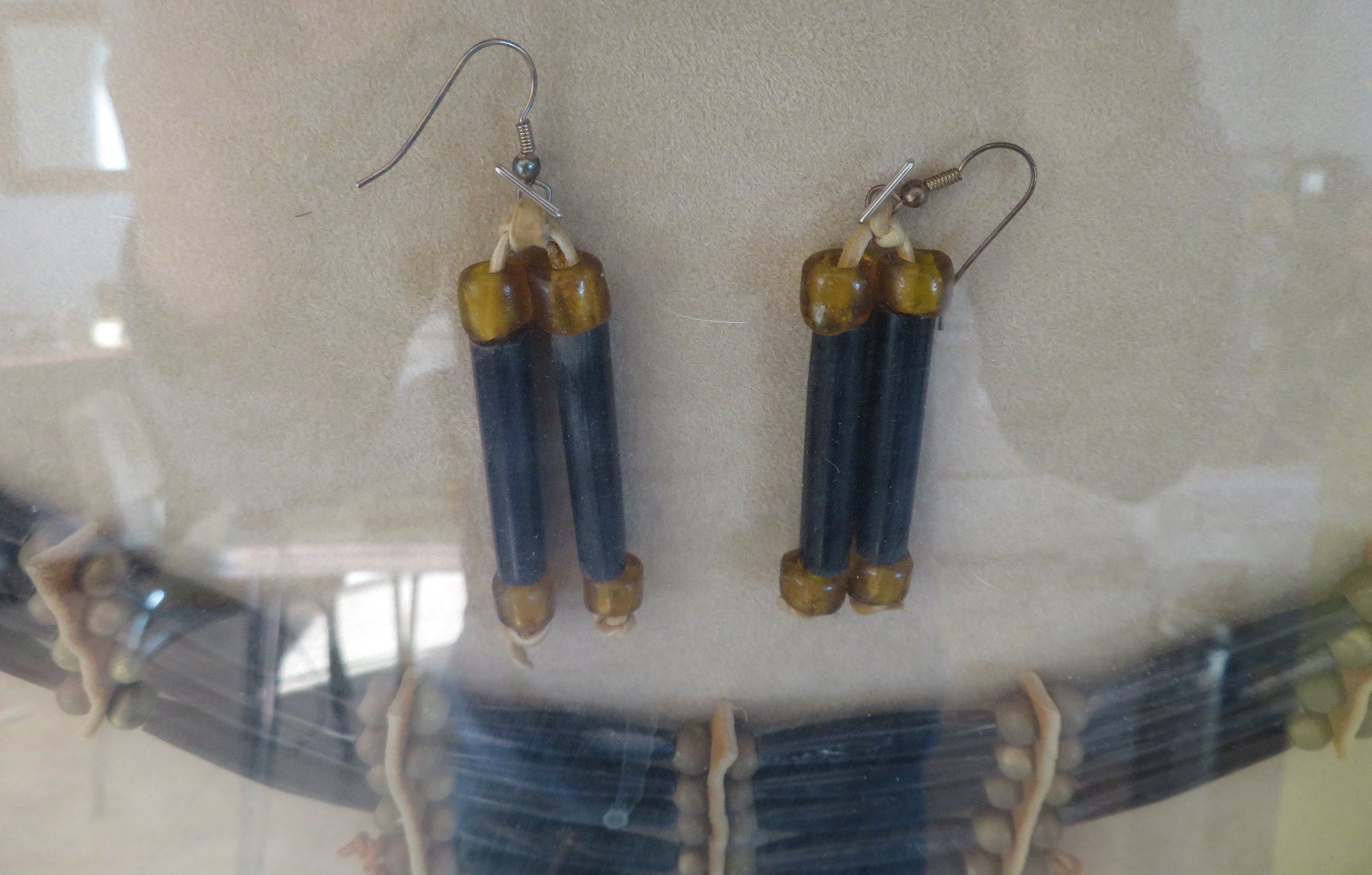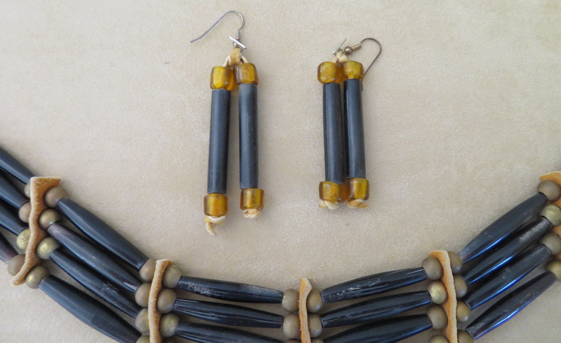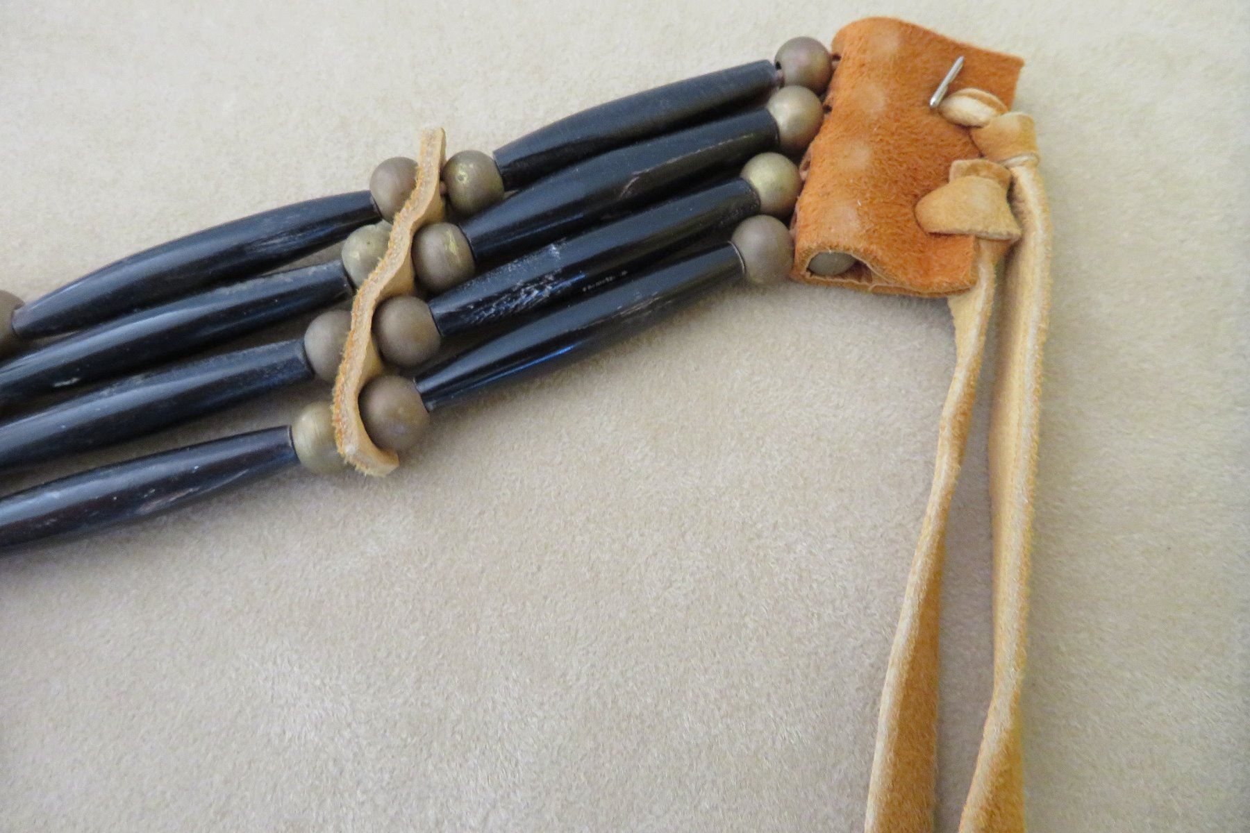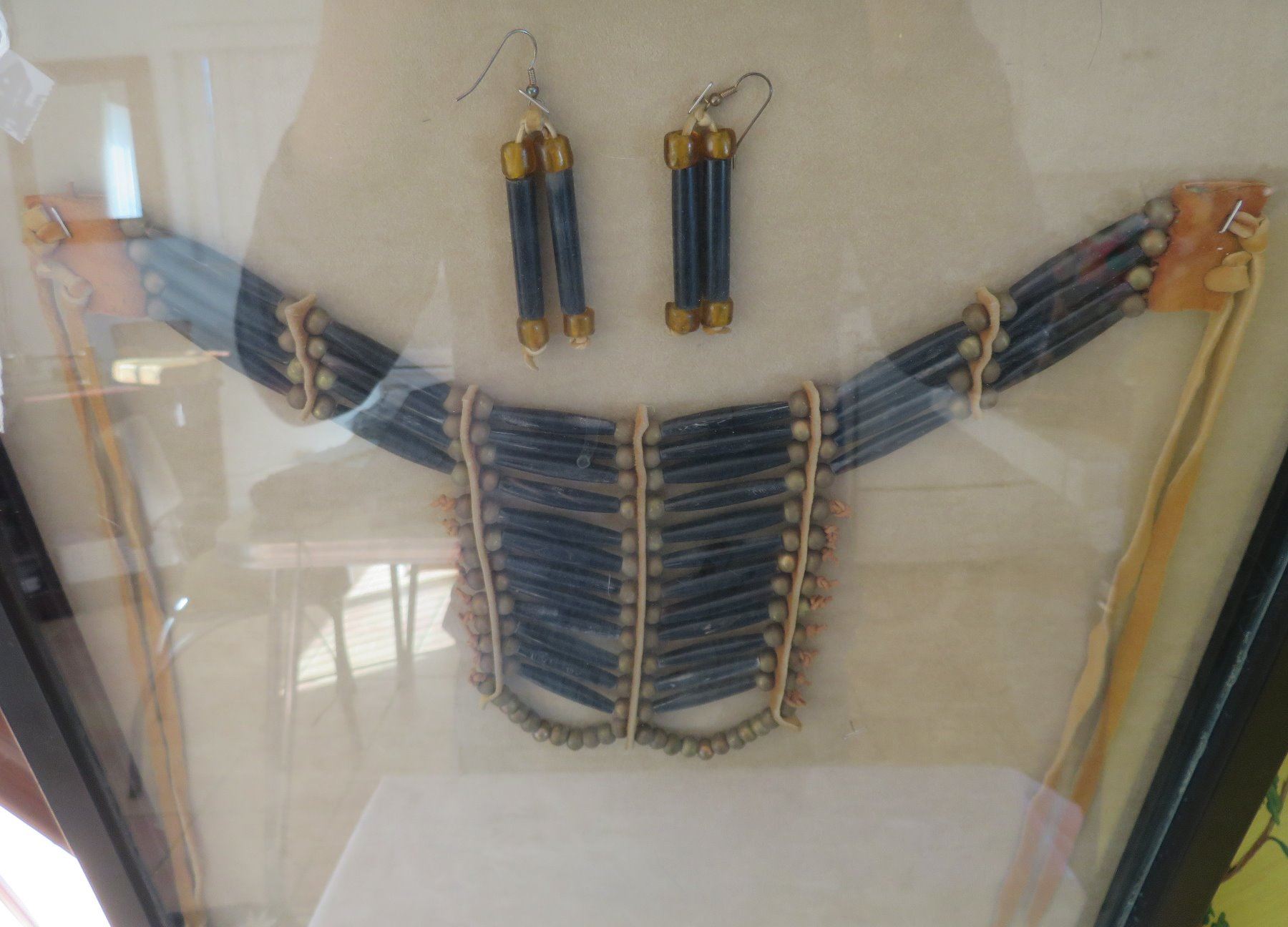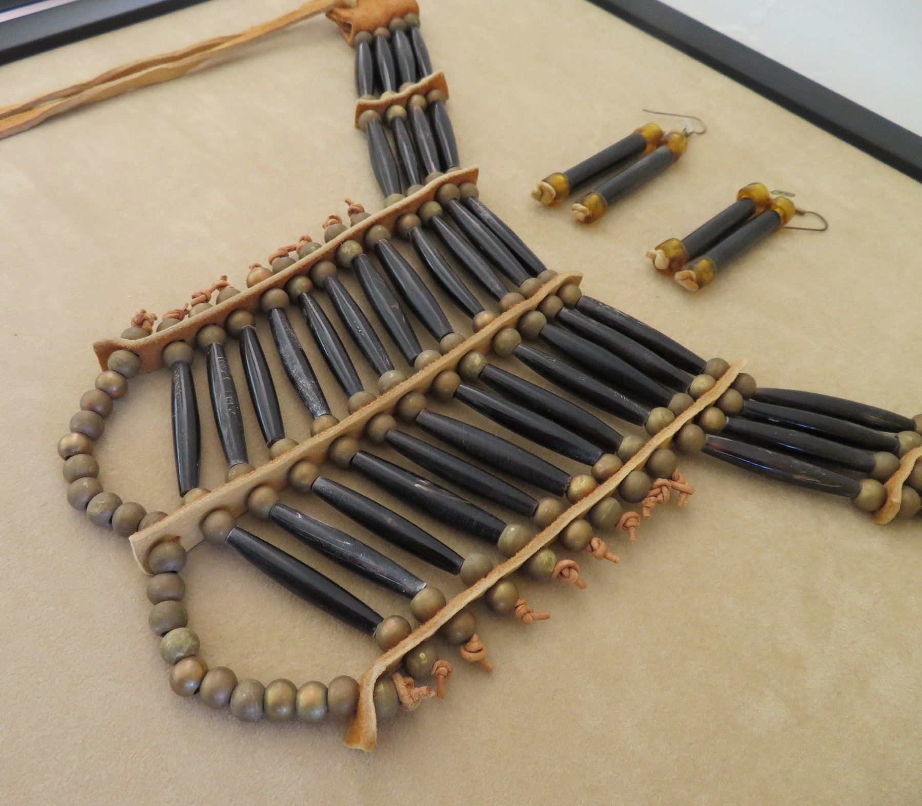 Bone Breast Plate in Frame, 20th century item. Made of bone, brass, leather, metal and beads, the item measures approx. 12 1/2" x 8", earrings 2 1/2" long. Sioux. Also includes matching earrings for pierced ears. Condition: Good, see images. Shipping: $40.00 USA estimate only, w/insurance and signature.