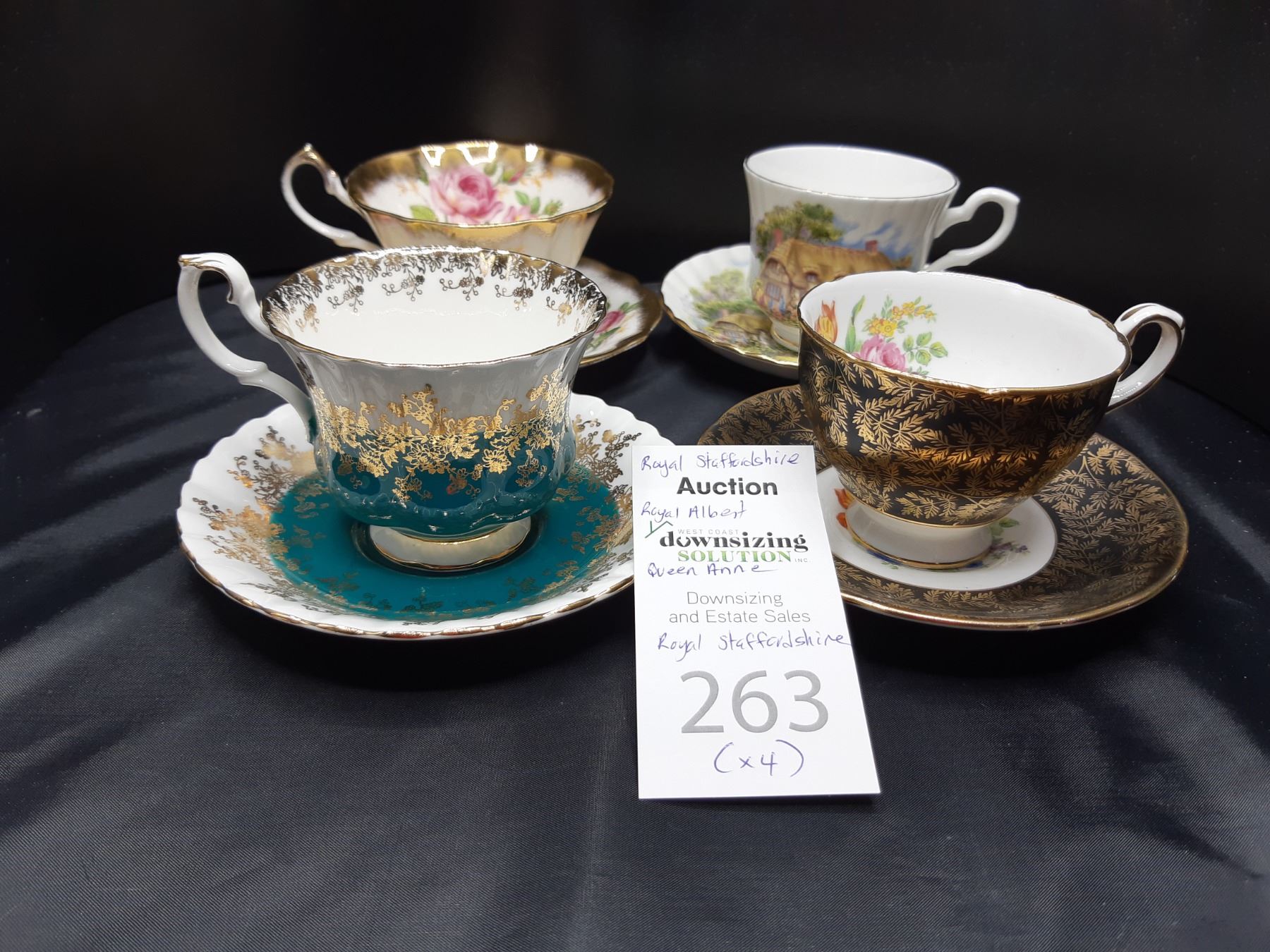 Royal Staffordshire, Royal Albert, Queen Anne, 4 teacups and saucers. Bring packing material and pickup at 9 am