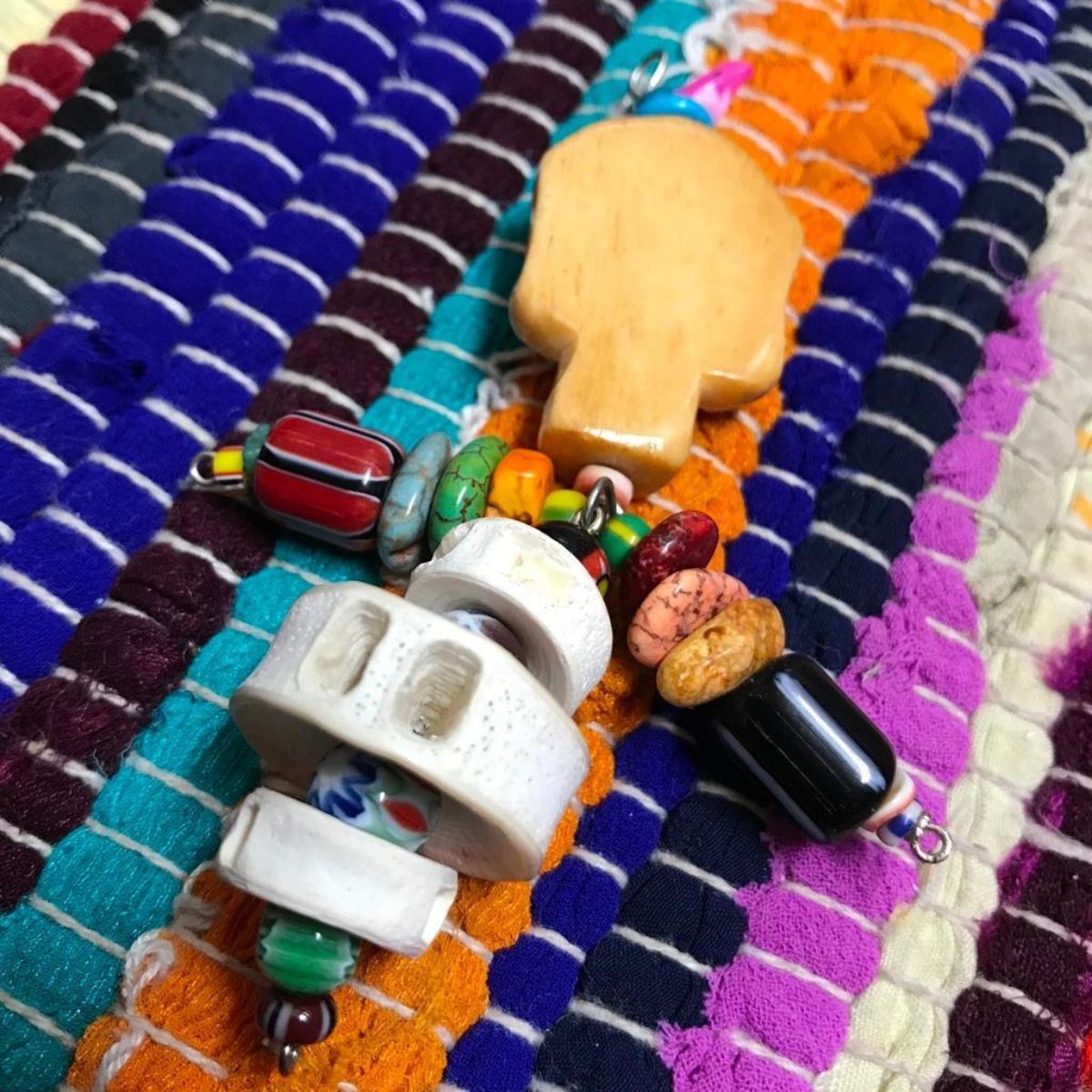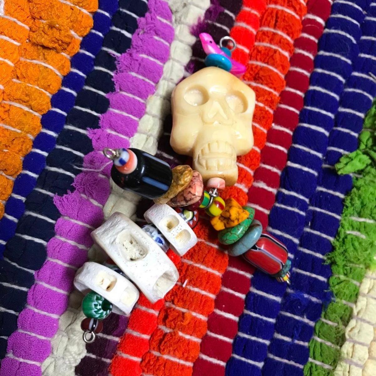 Hand-carved bone skeleton skull bead with shell, gemstones & African sand cast beads, crafted into an artisan Muertos pendant. 3 3/4" H X 2 1/2" W.Â