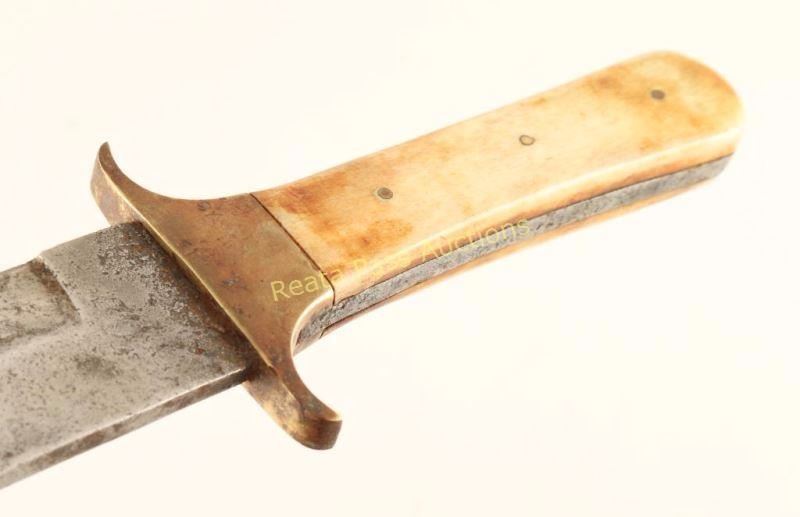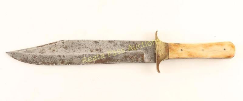 Steel blade with battle scars and brass guard. Bone handle has brass tack design. Measures 15 1/4" overall with a 10" blade.