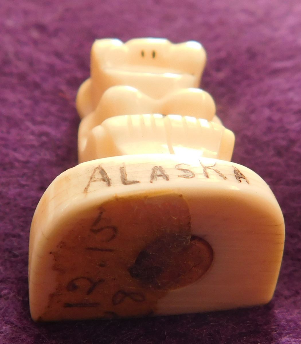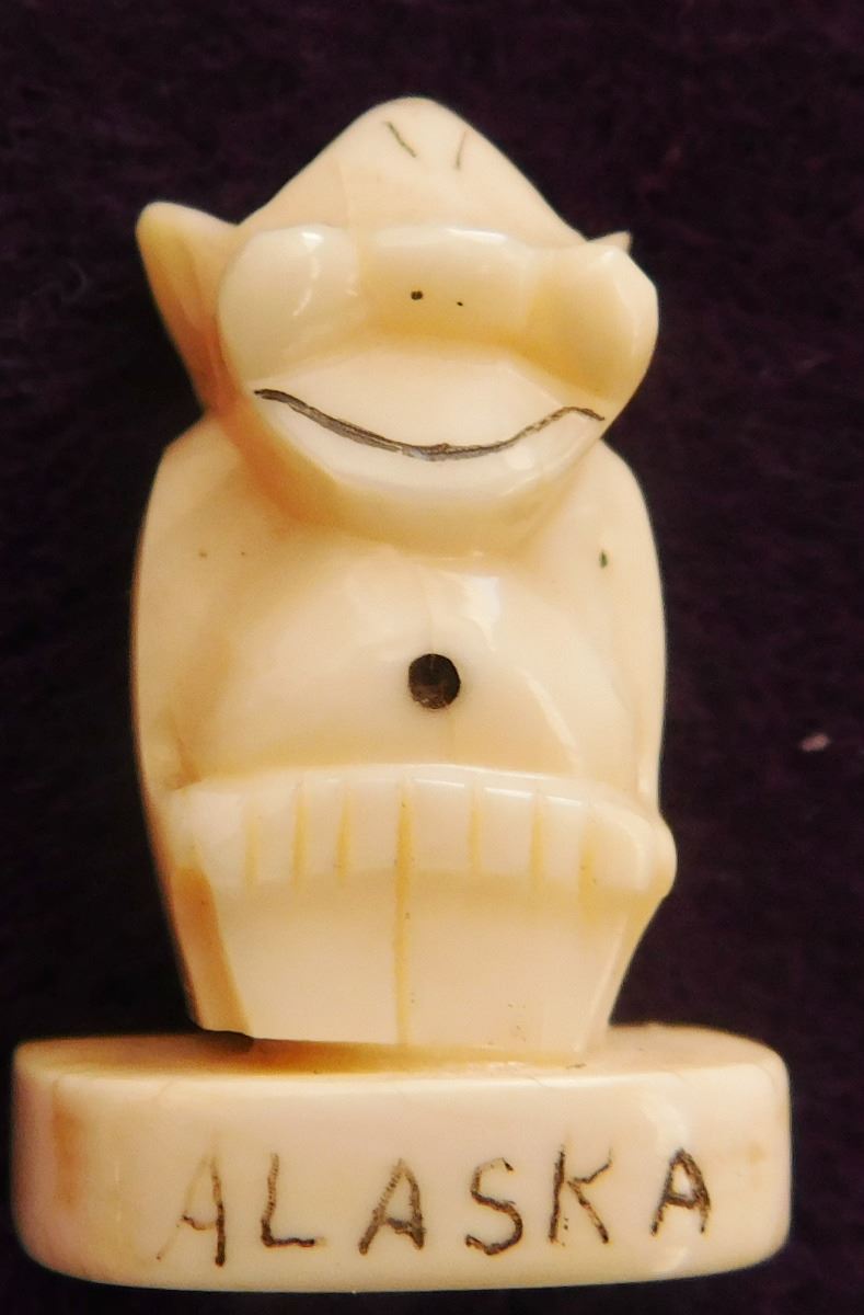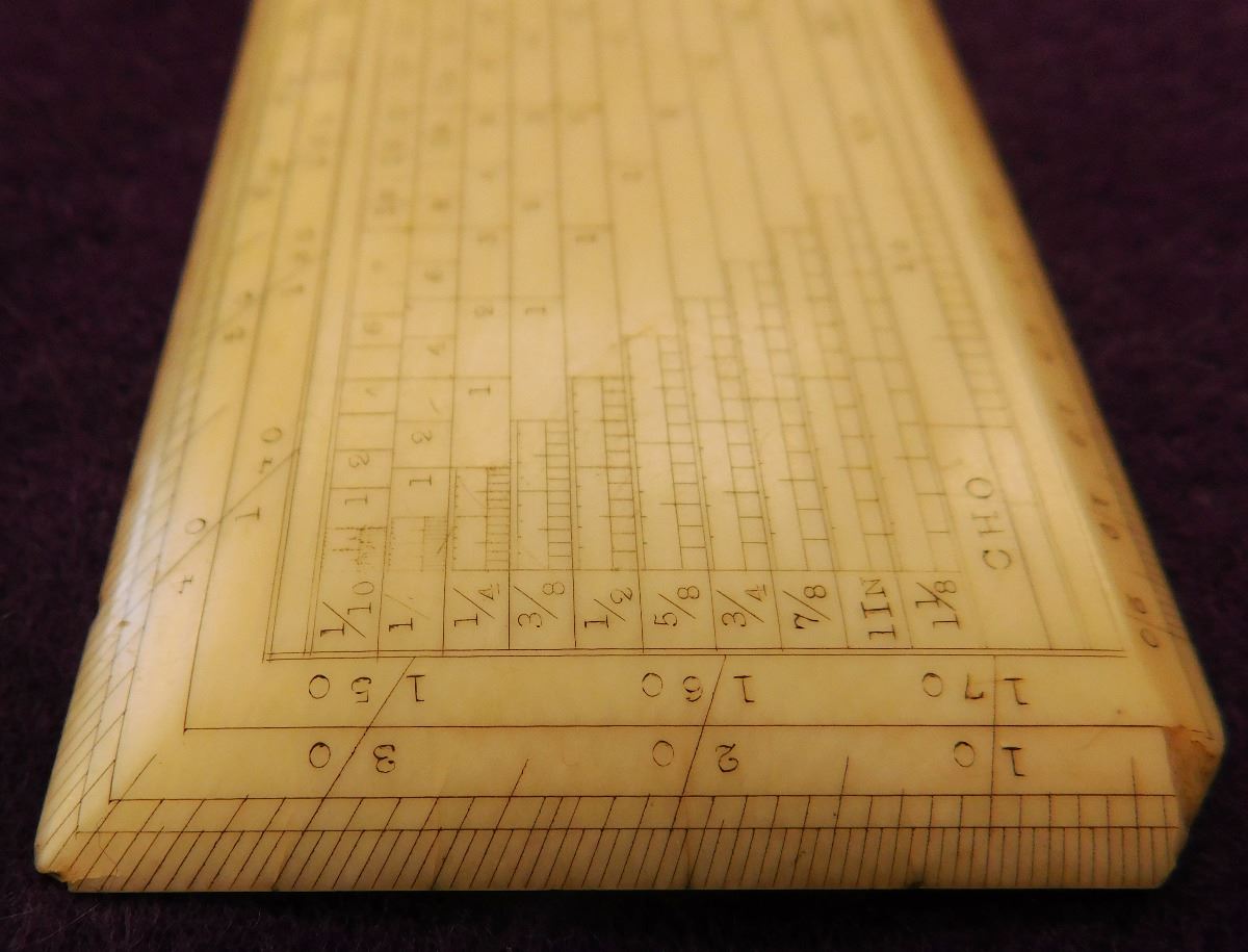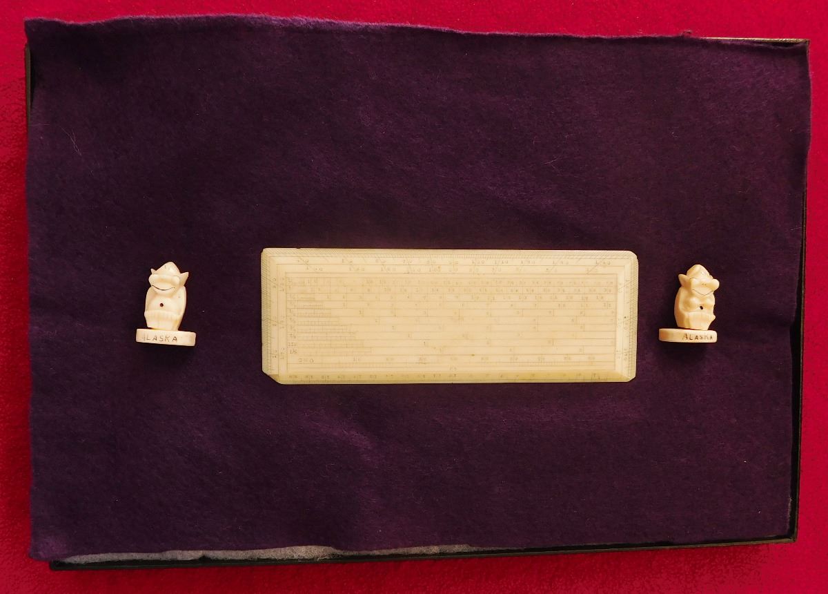 Bone Mariner's Charting Tool & 2 Eskimo Figures, circa 1890s. Made of bone, the charting tool measures 6" x 2". The two figures are salt & pepper shakers. The charting tool is probably German. Finest handiwork I've ever seen! Very fine engraving. Frame not included. Condition: Minor nicks on corners, see images. Shipping: $25.00 w/insurance.