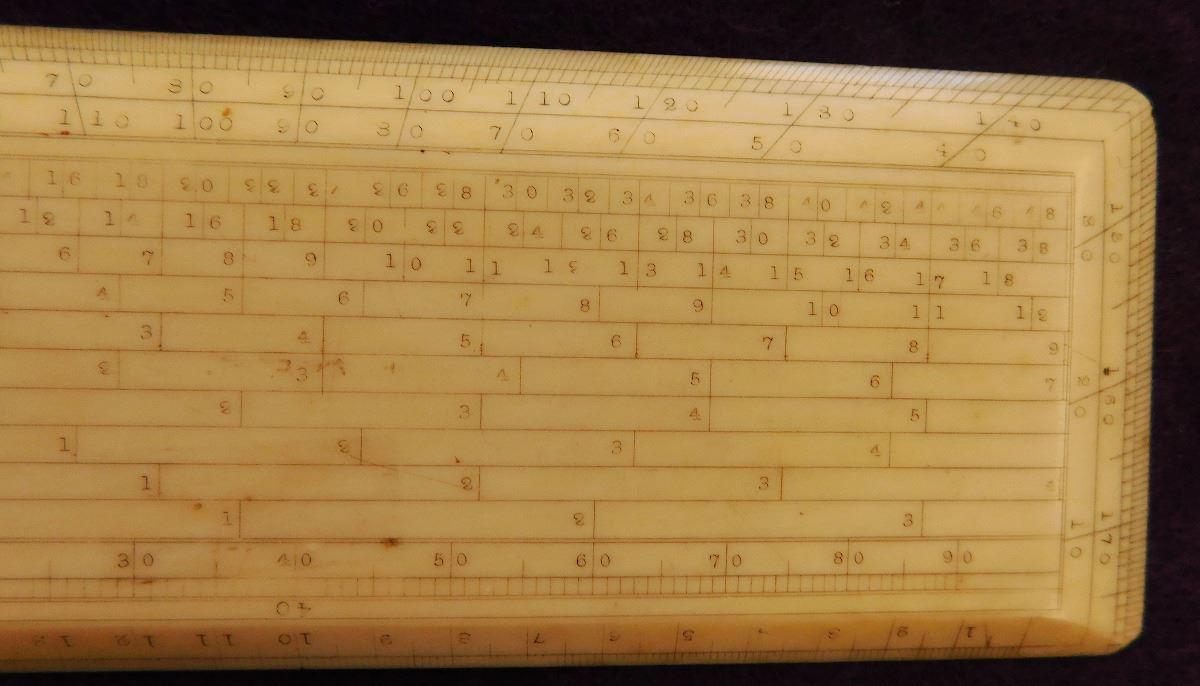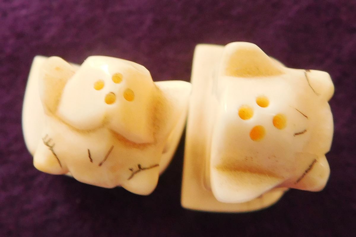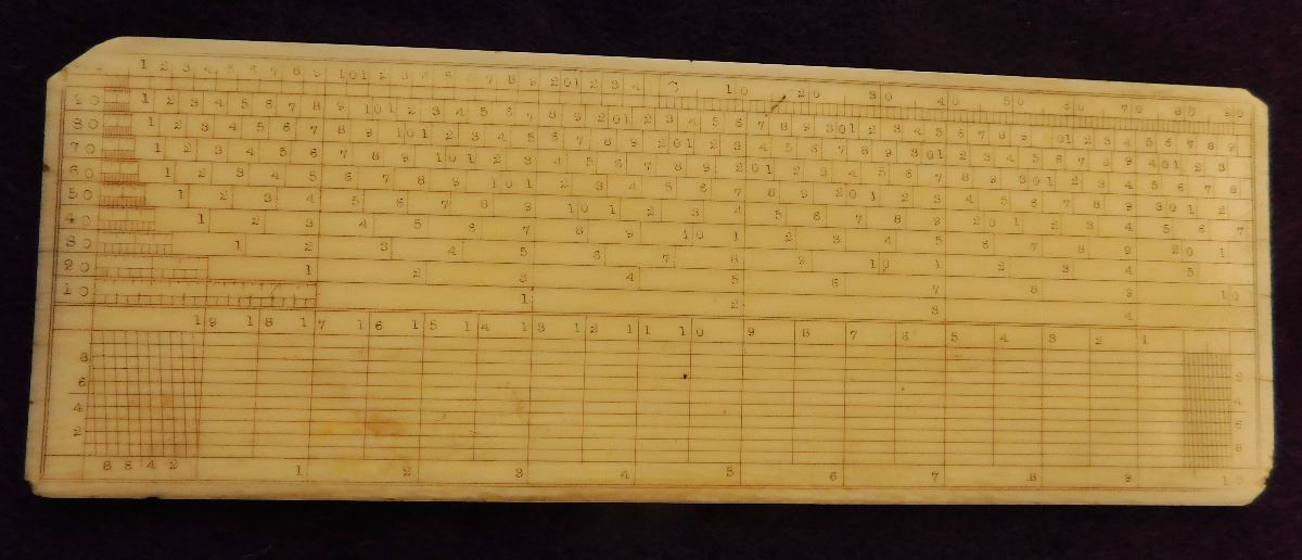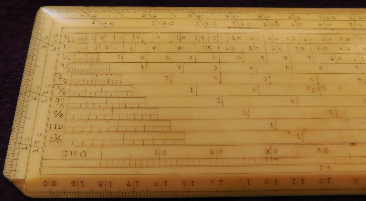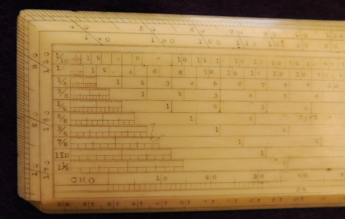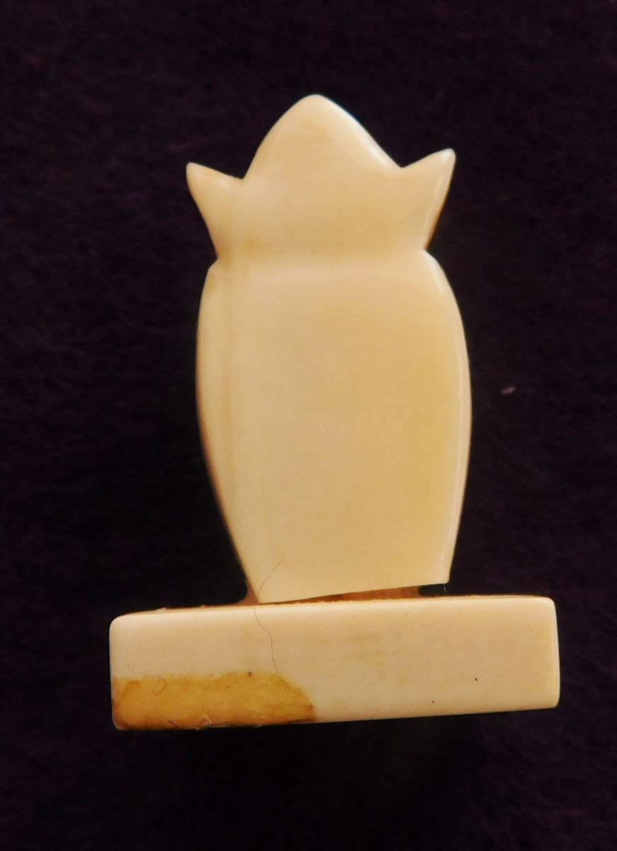 Bone Mariner's Charting Tool & 2 Eskimo Figures, circa 1890s. Made of bone, the charting tool measures 6" x 2". The two figures are salt & pepper shakers. The charting tool is probably German. Finest handiwork I've ever seen! Very fine engraving. Frame not included. Condition: Minor nicks on corners, see images. Shipping: $25.00 w/insurance.