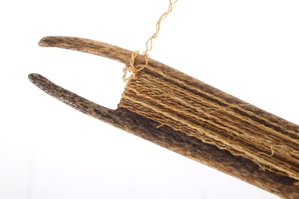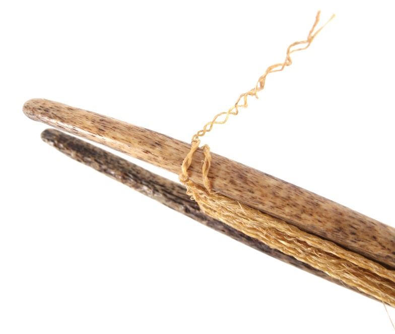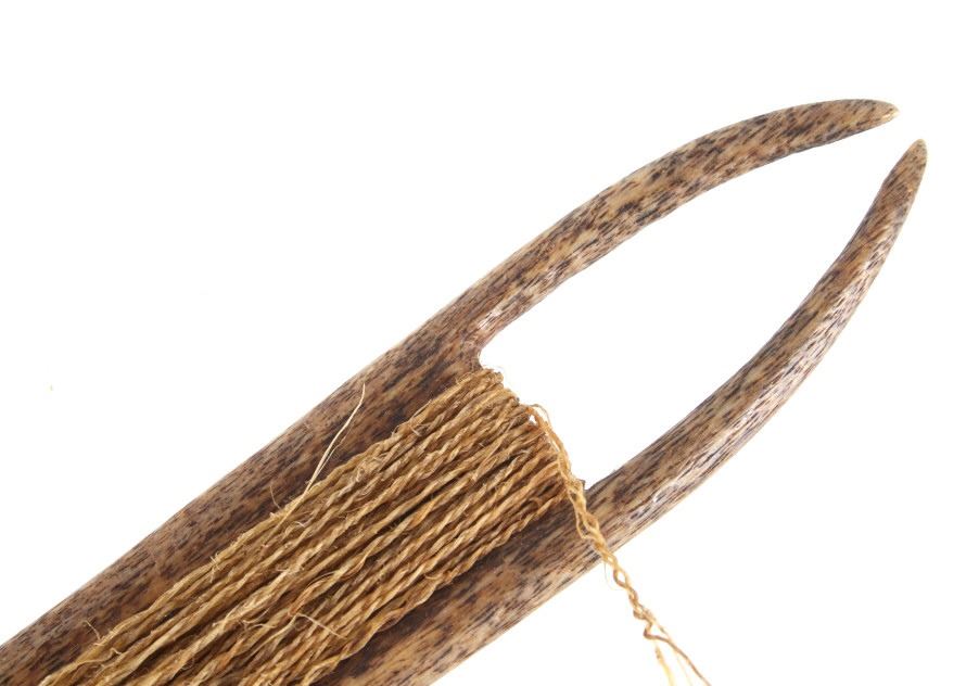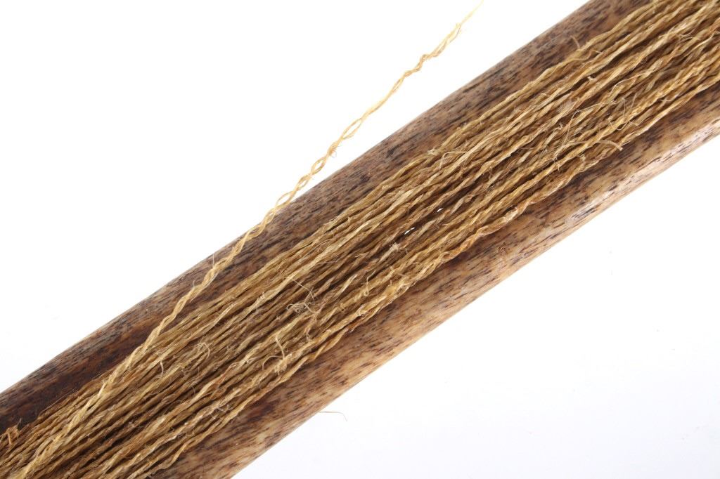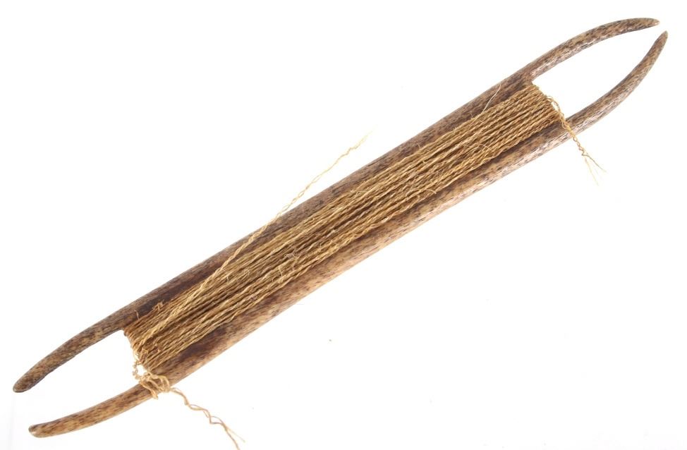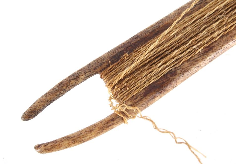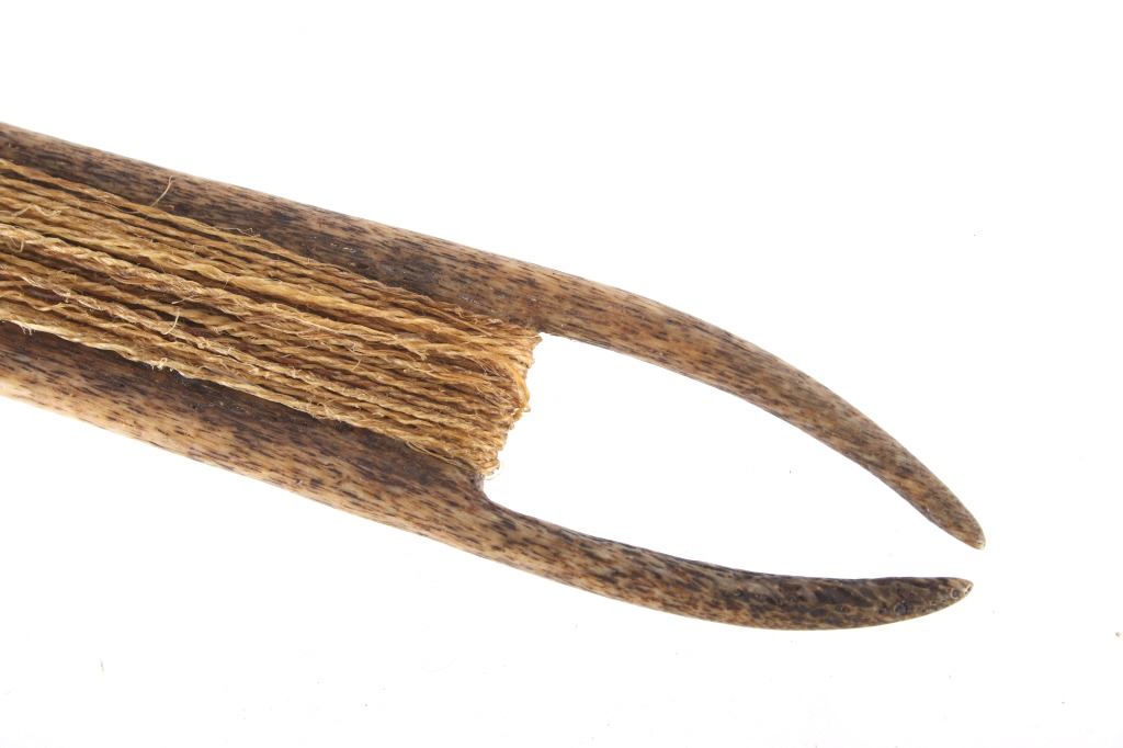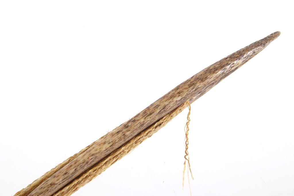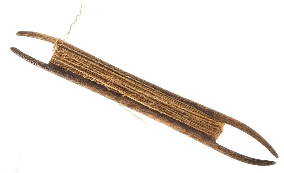 For your bidding pleasure is this fantastic net sewing shuttle, or fish line bobbin, with sinew thread. This artifact is made of bone and is in the style of the Thule period, 1200 AD-1700 AD. The shuttle measures 8" long and 1" wide. The bone shows wonderful patina. The sinew is very fragile.
