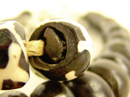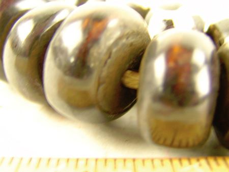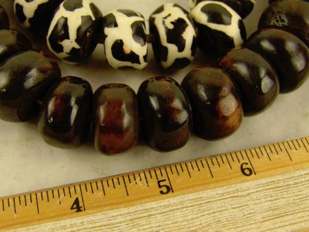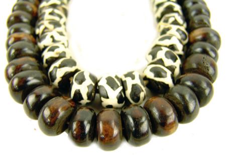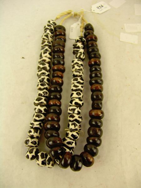 Late 1900s, Two strands of hand carved African bone beads in brown and batik, all with hand carved wooden inserts. Very good condition. 24" each