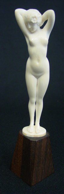 Ca. 1920's. "Female Nude with a Flower in her Hair", on a wooden base. Approx. 407/8" H without base, 7.25" with base. Please read our terms of sale.