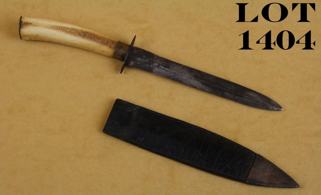 Bone gripped dirk with leather scabbard, approx. 9-1/2” overall with an approx. 5-1/2” blade in overall fair condition showing scattered erosion areas on the blade with some prior cleaning, nicely aged bone grip;scabbard is leather with some cracking and metal tip, missing metal throat. Est.: $70-$140.